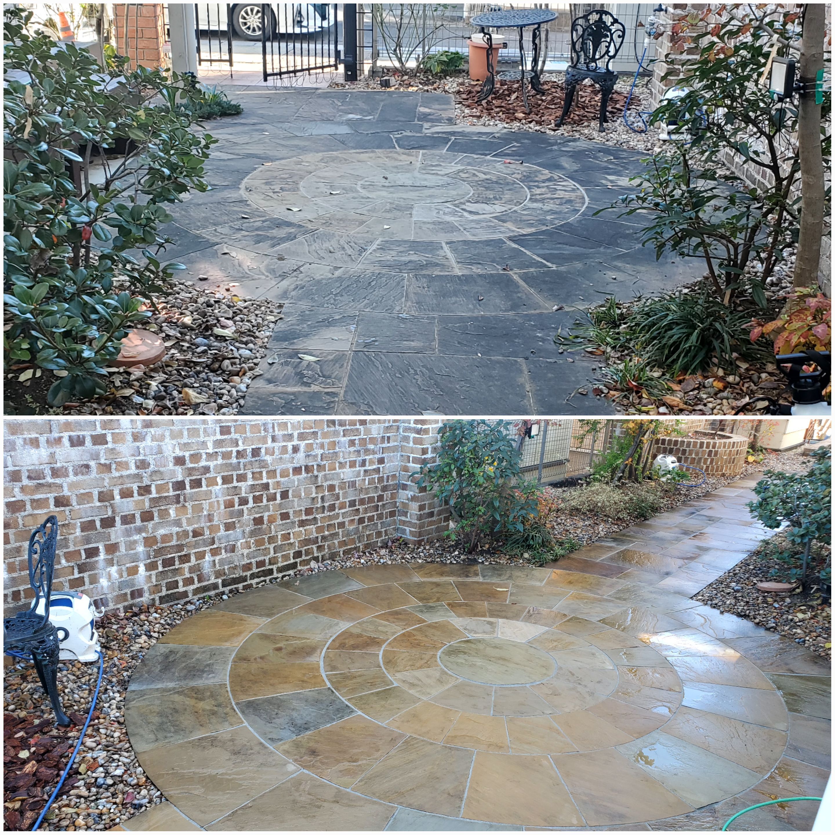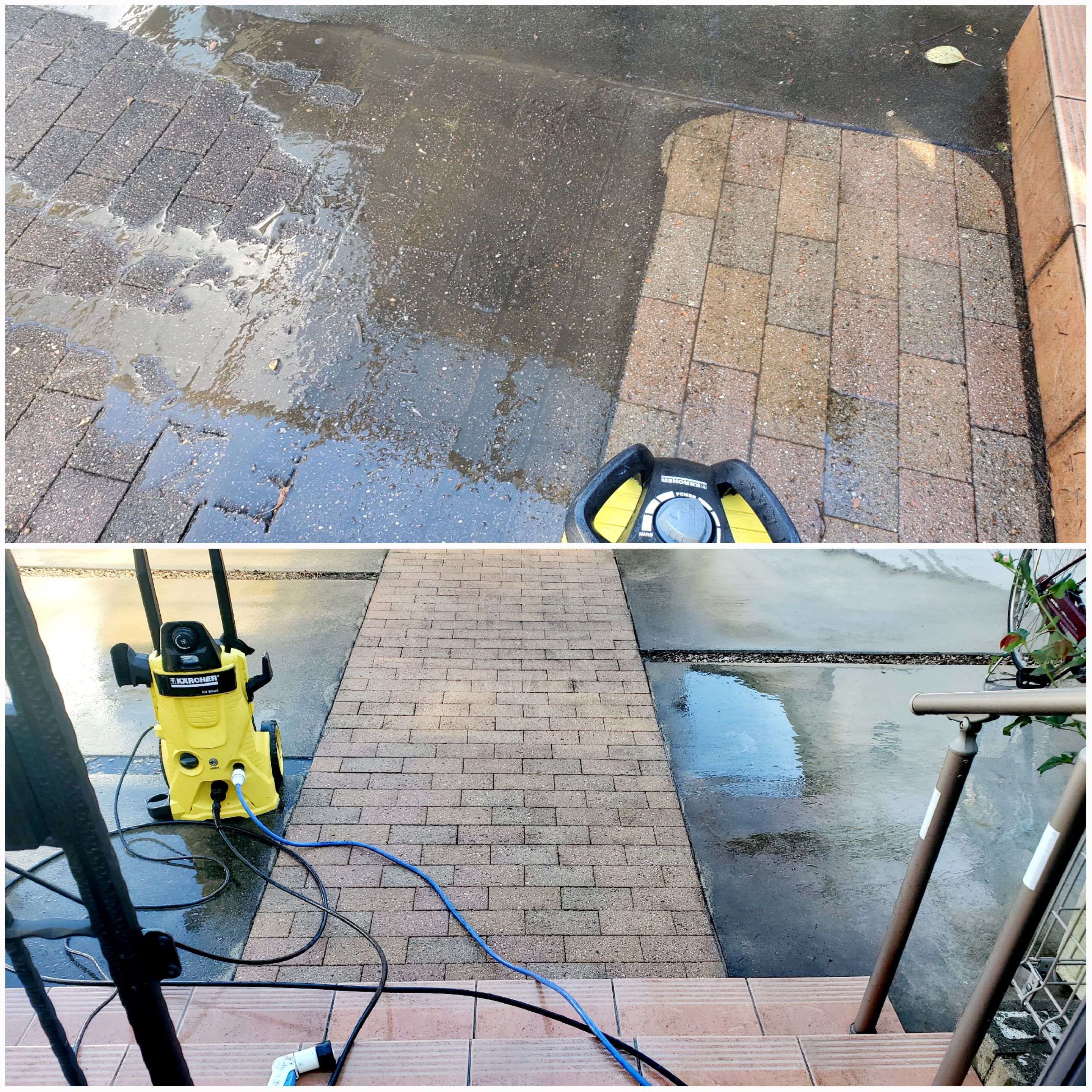 リピータのお客様より相談を受けていた、お庭のクリーニングです。オシャレな敷石で一面を敷き詰めておりますが