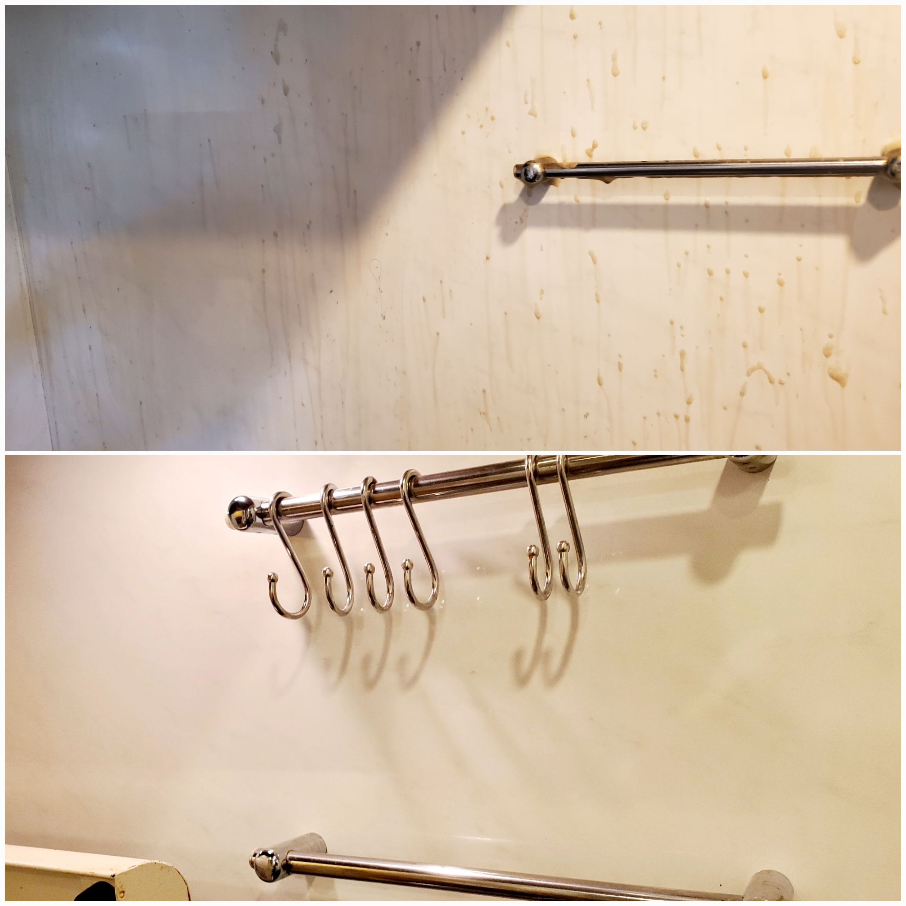 ご相談の上、水回り2点セットとなりました。長年の油汚れが壁一面に頑固に固着しており、洗剤塗布し時間を置きながら清掃していきます。