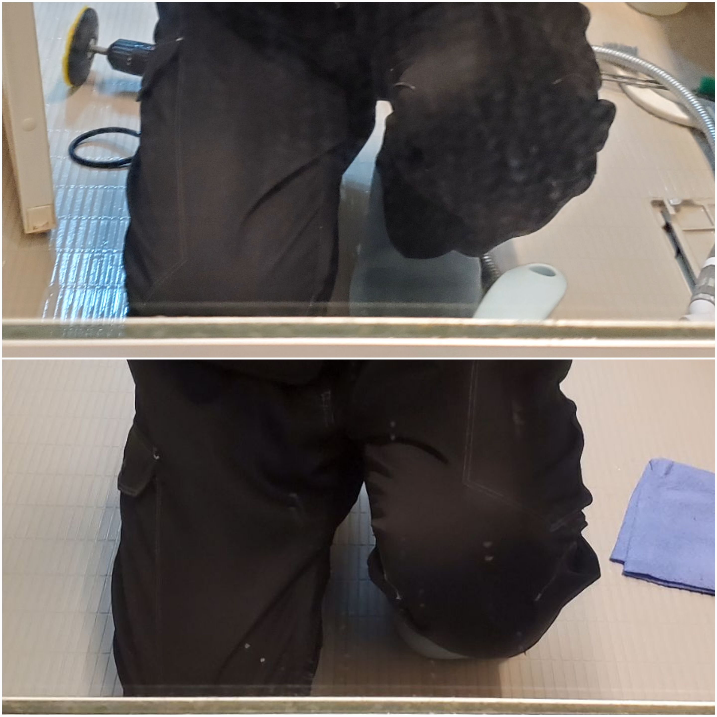 樹脂製の浴槽なので傷が付かないように溶剤で優しく溶かしながら徐々に取り除いていきます。おかげ⭐輝きが増しました