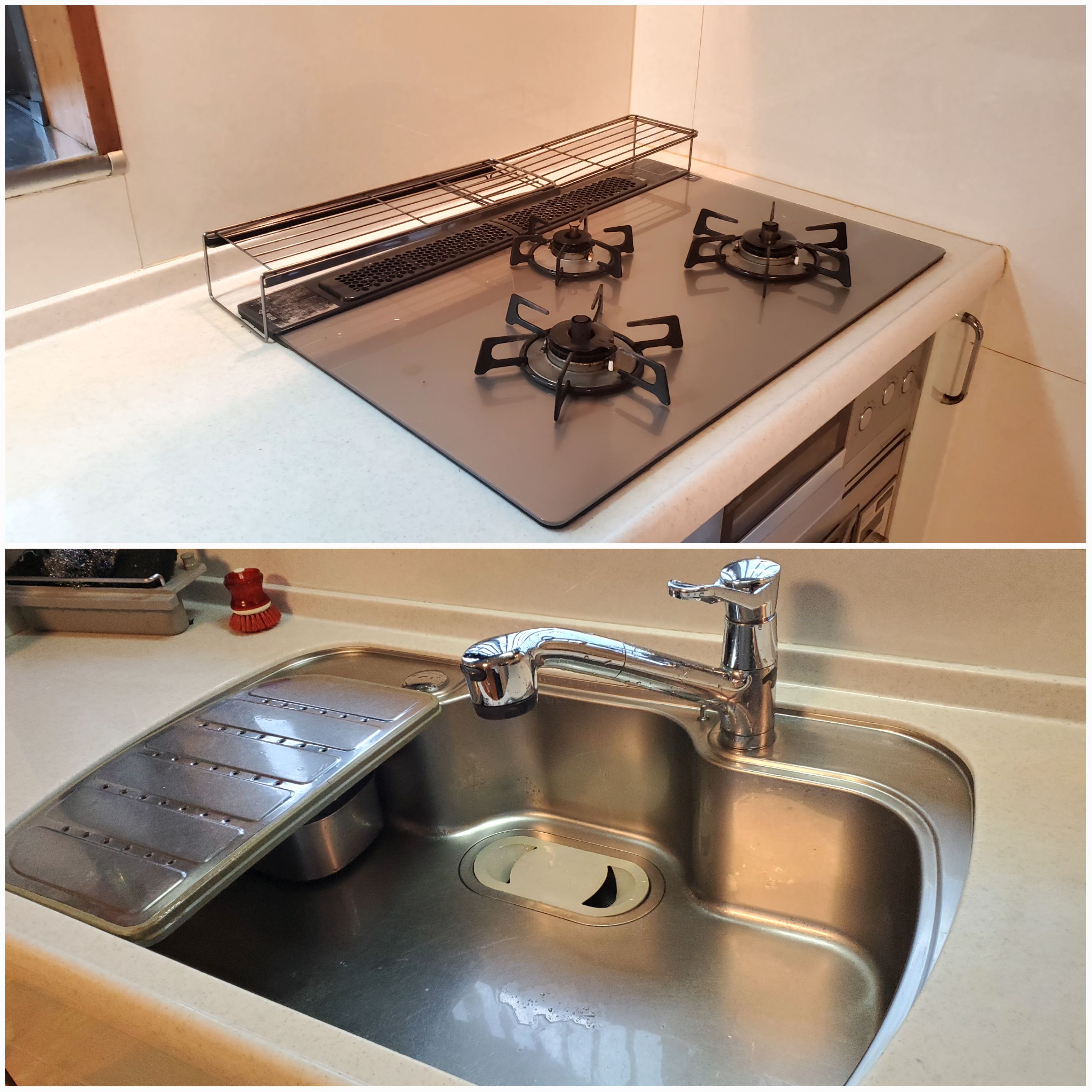 人工大理石の黄ばみも漂白し✨キレイに、ガスコンロの五徳やプレートの頑固なコゲはつけ置きを数回行う事で何とかキレイに・・・