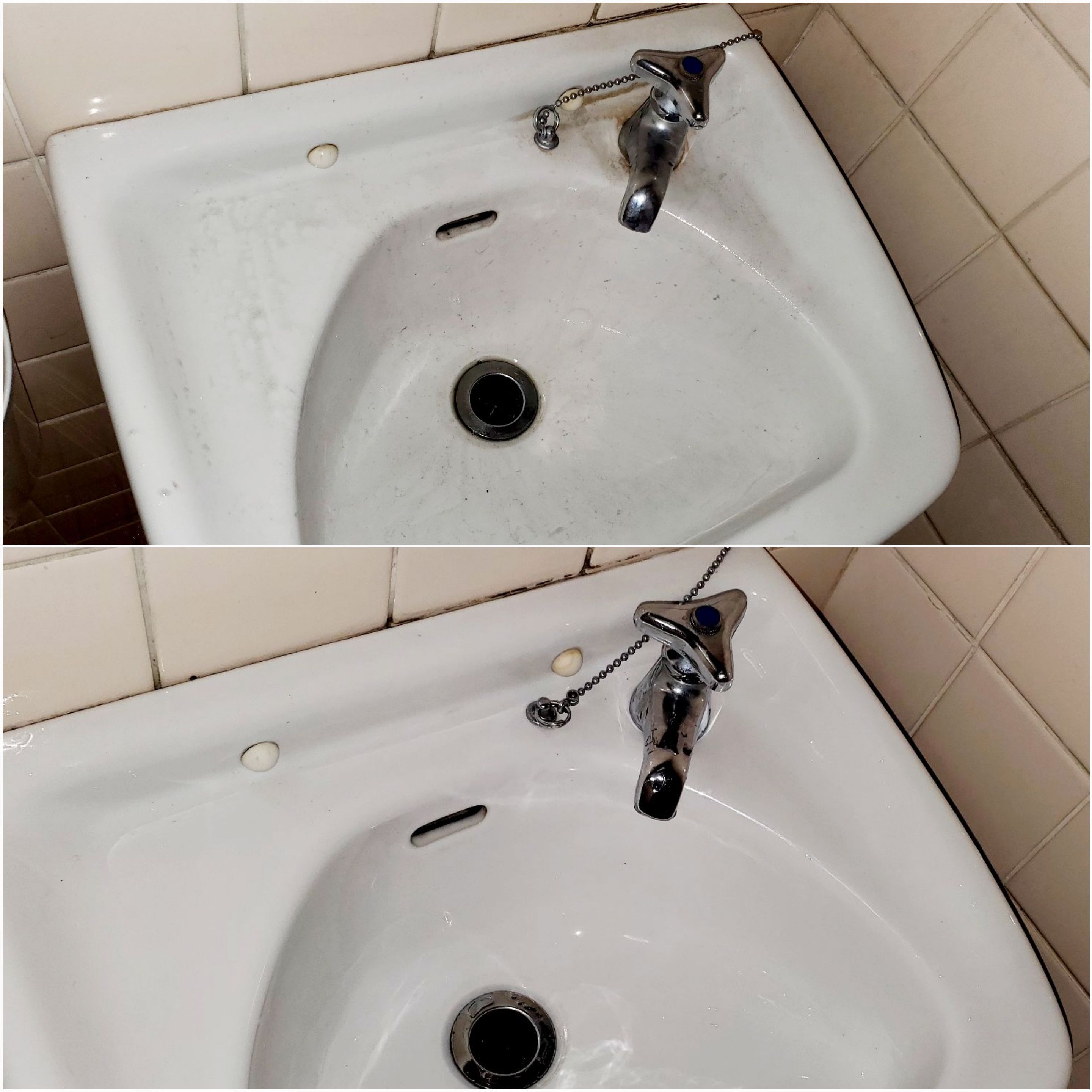 手洗い洗面も黒ずみと水栓周りの水垢で黒くなっています。