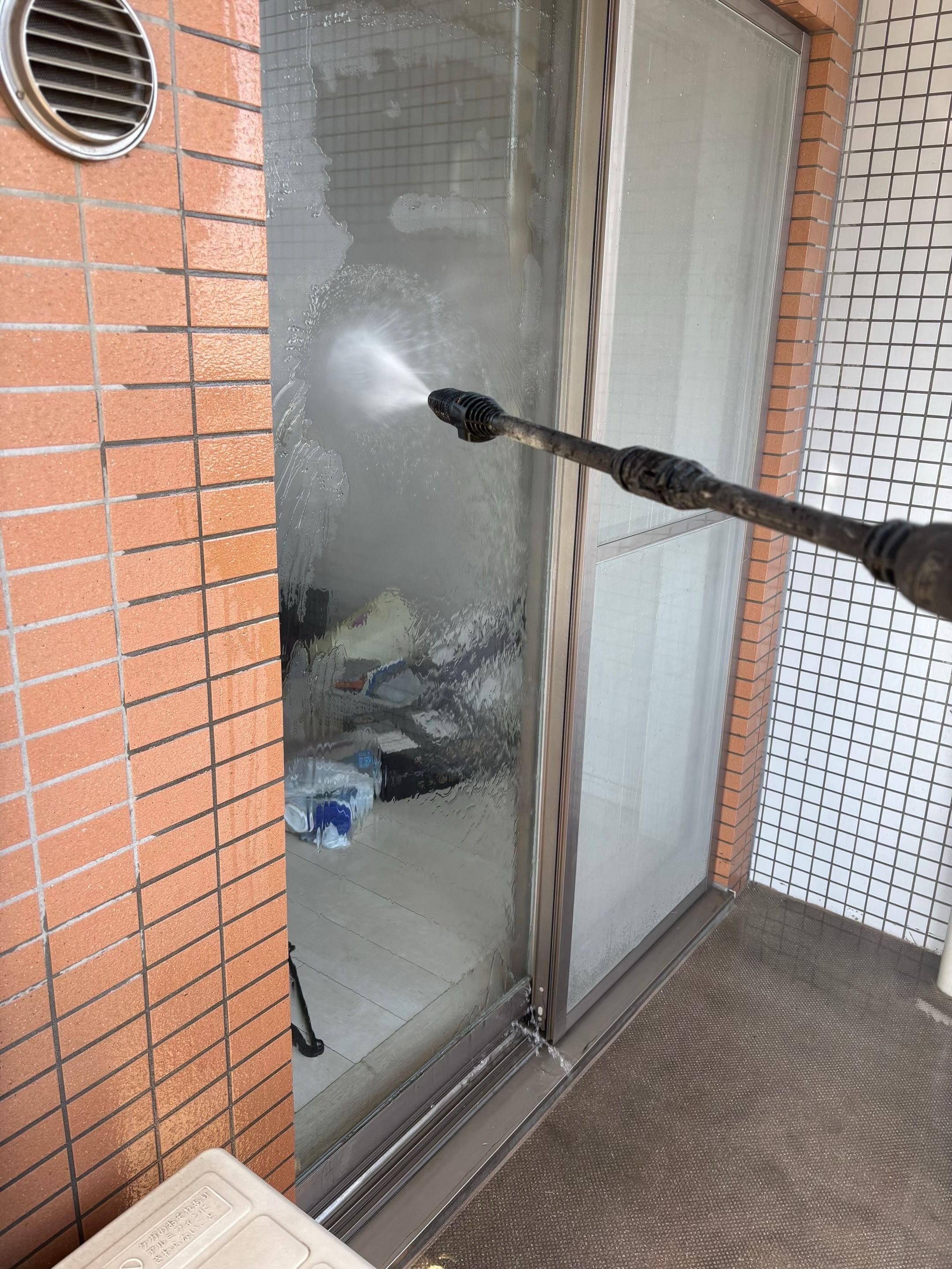 まずはベランダの高圧洗浄から作業開始。長年蓄積した砂ぼこりや黒ずみ、排水口周辺の汚れまでしっかりと洗い流しました。高圧洗浄を行うことで、見た目が明るくなるだけでなく、衛生面の改善にもつながります。