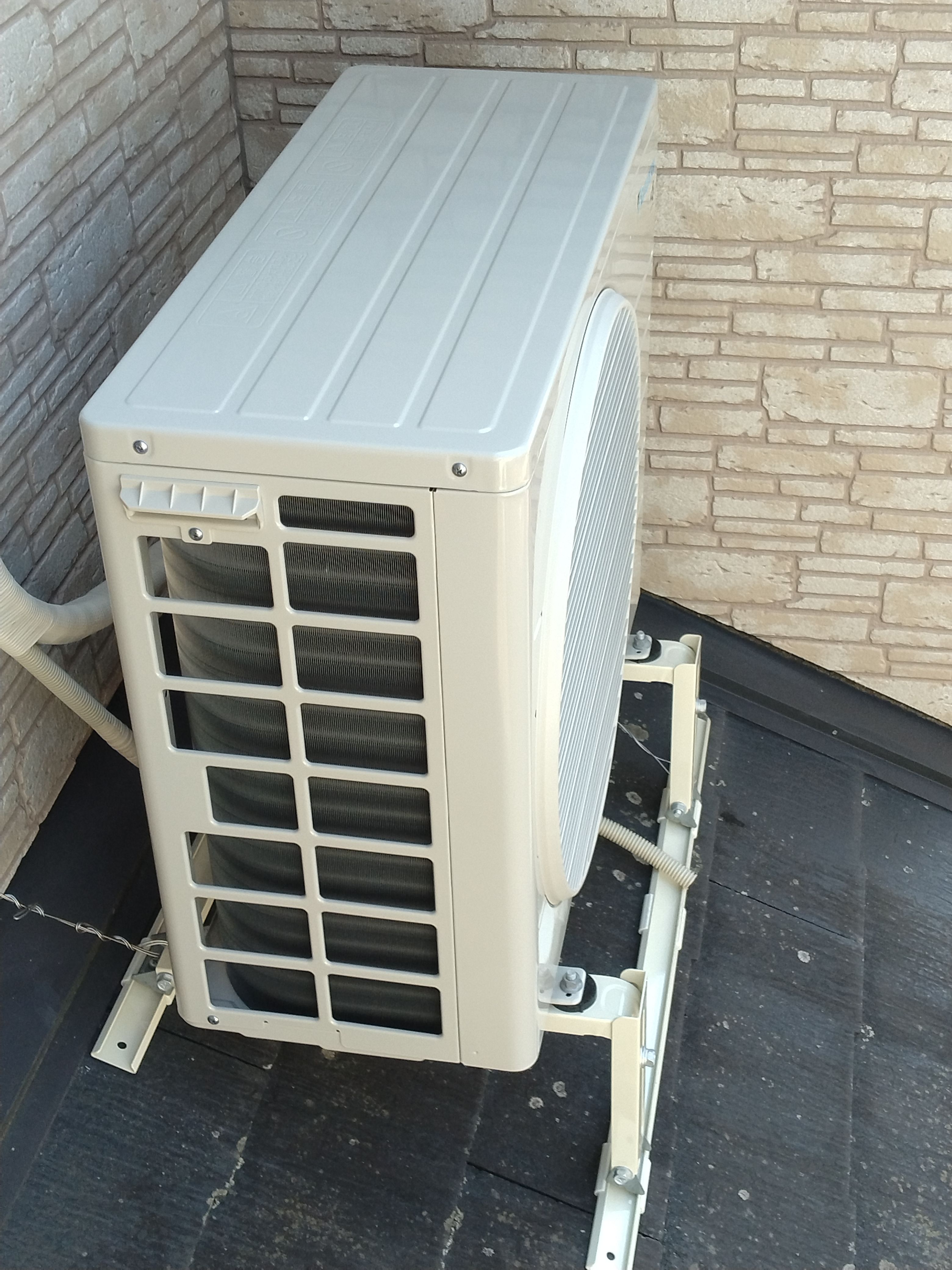 その後、早良区でエアコン工事をしました。こちらも建築屋さんからの依頼です。室外機屋根置きでした。
