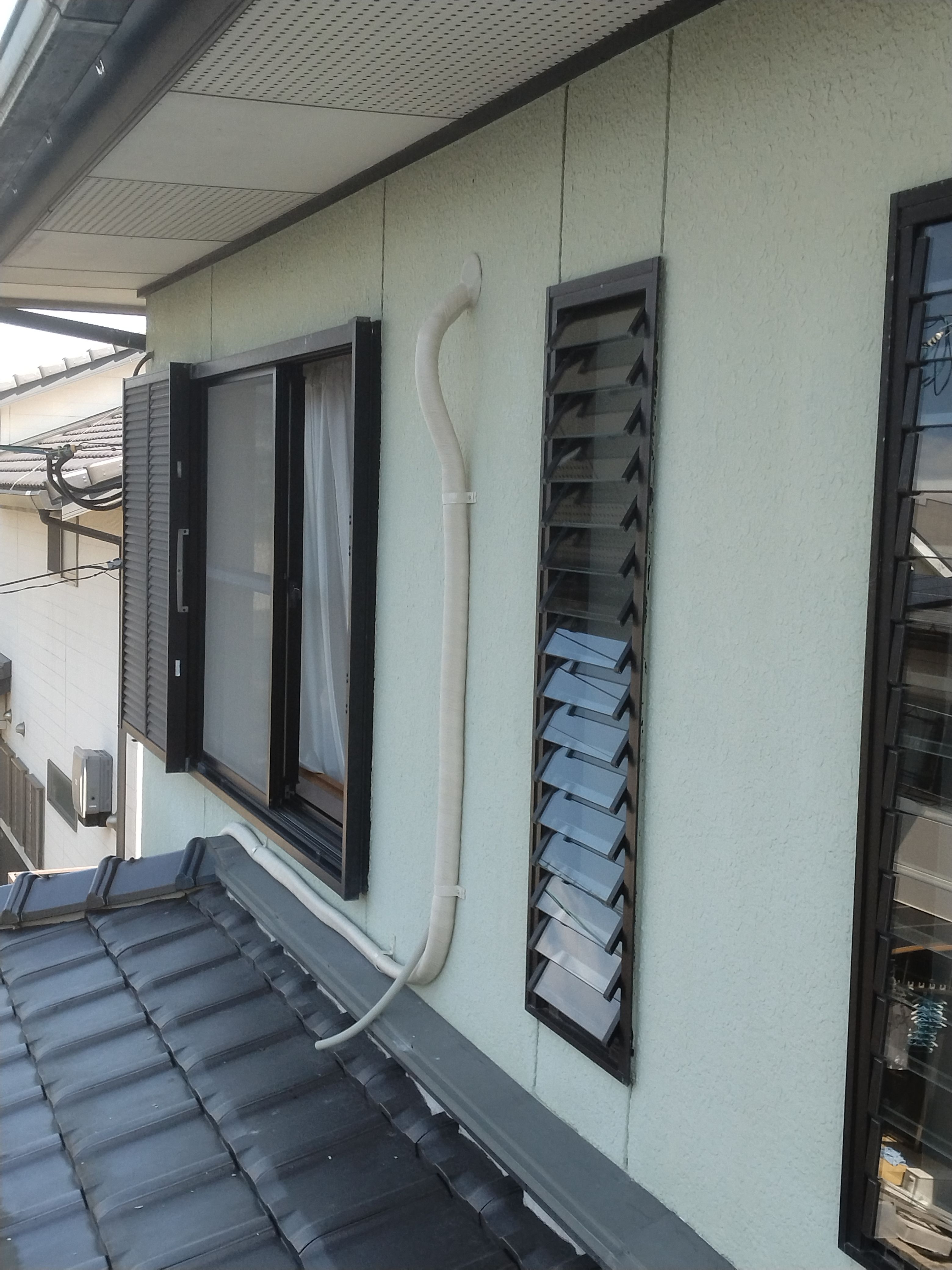 もう1台は屋根置きか立ち下げ工事かでしたが音が気になるとの事で立ち下げ工事になりました。屋根をかわして10m配管でした。