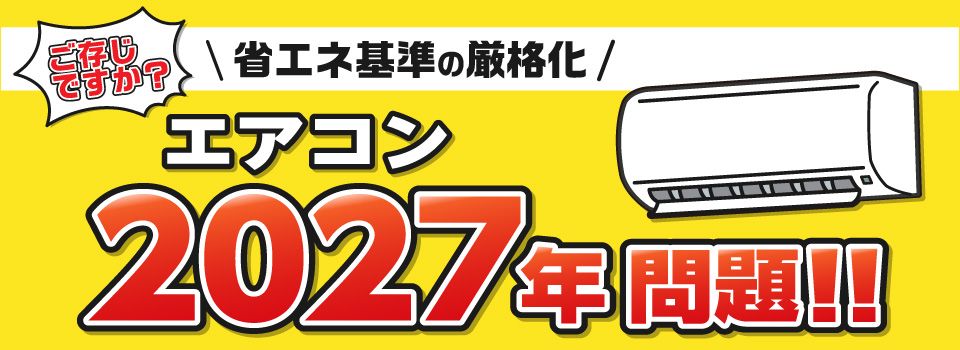 「2027年度からエアコンの省エネ基準が大幅に厳格化される問題です。この新基準を満たせない多くの現行モデル(特に安価なスタンダードモデル)が製造・販売できなくなり、基準適合のために高性能モデルが高価になることが予想されます。これによる価格上昇や、駆け込み需要による在庫不足、工事遅延などが懸念されています。 」