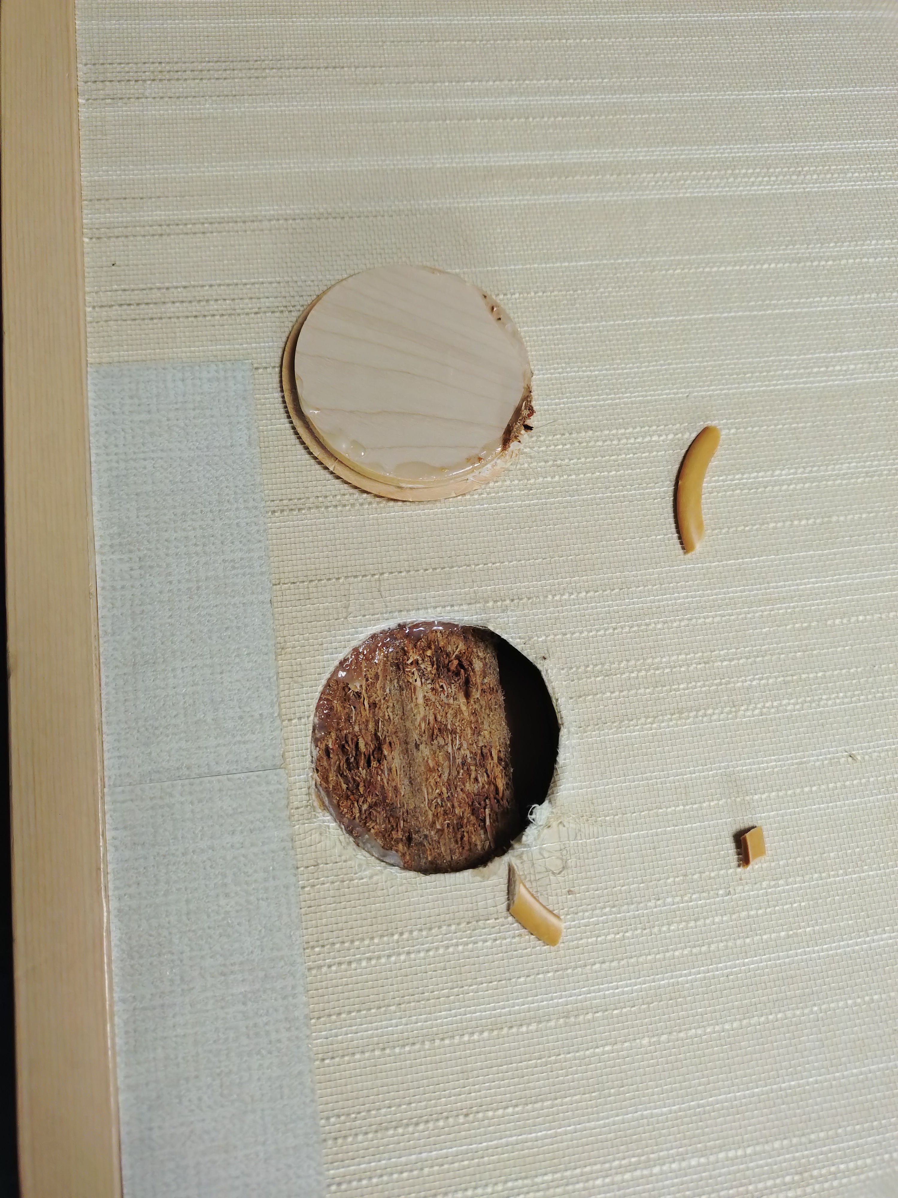 今回は引手釘が打たれていないために、ボンドで固定されていると思い込んでいましたが、ちょっと力を入れたら、ご覧のあり様です🔨‼️