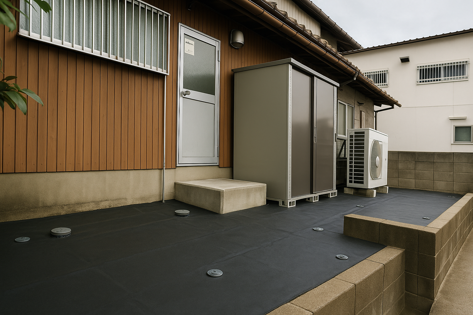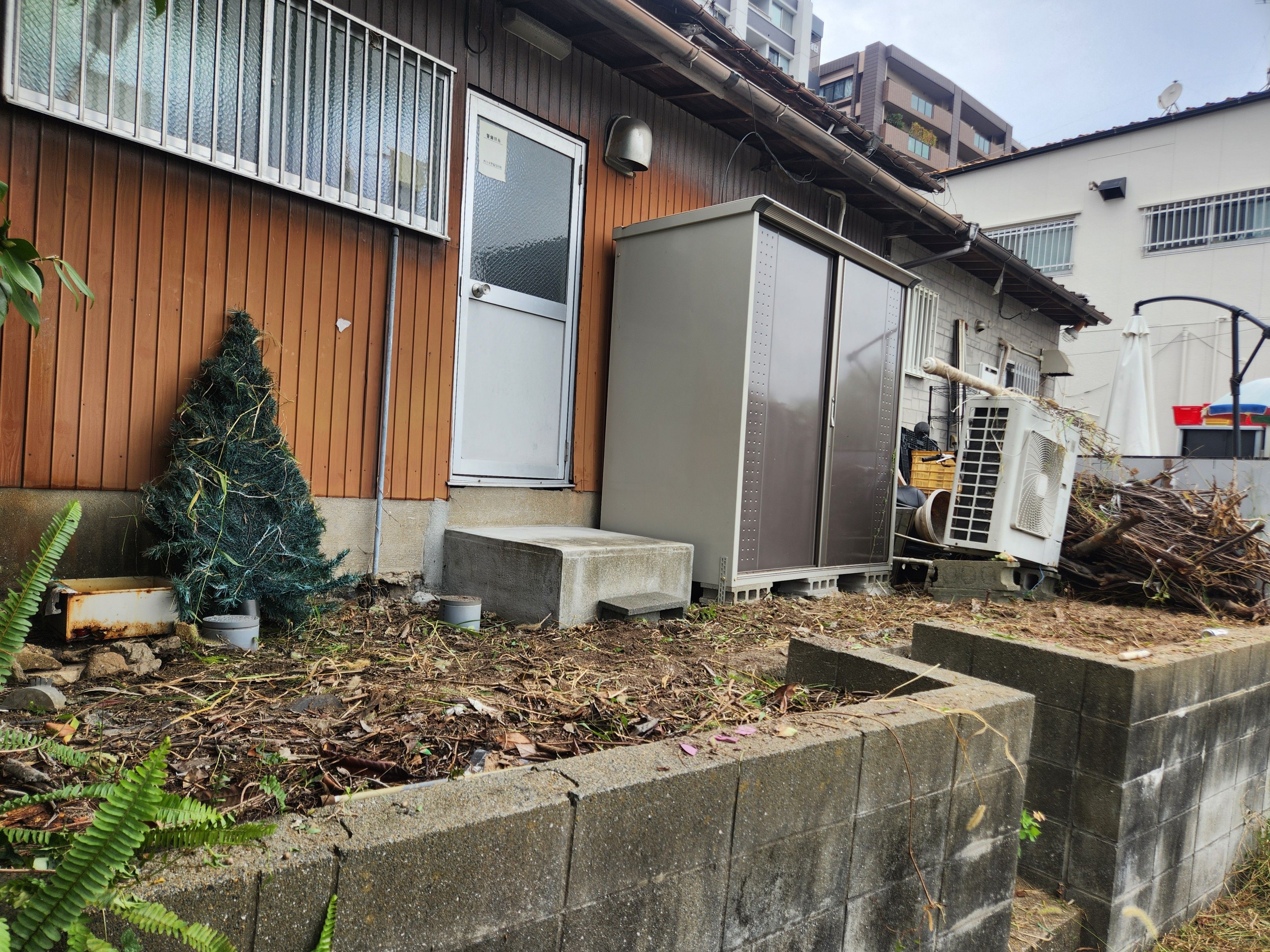 店舗裏の庭の草が抜いても抜いても生えてくるから、防草シートで生えないようにしてほしいとのこと。