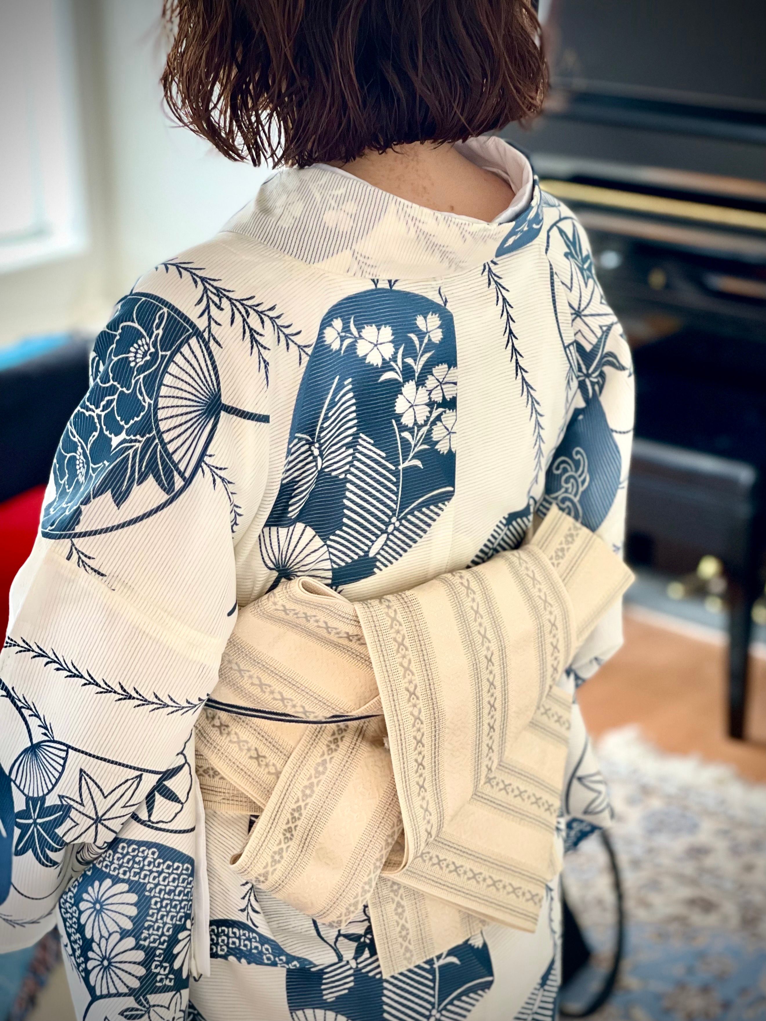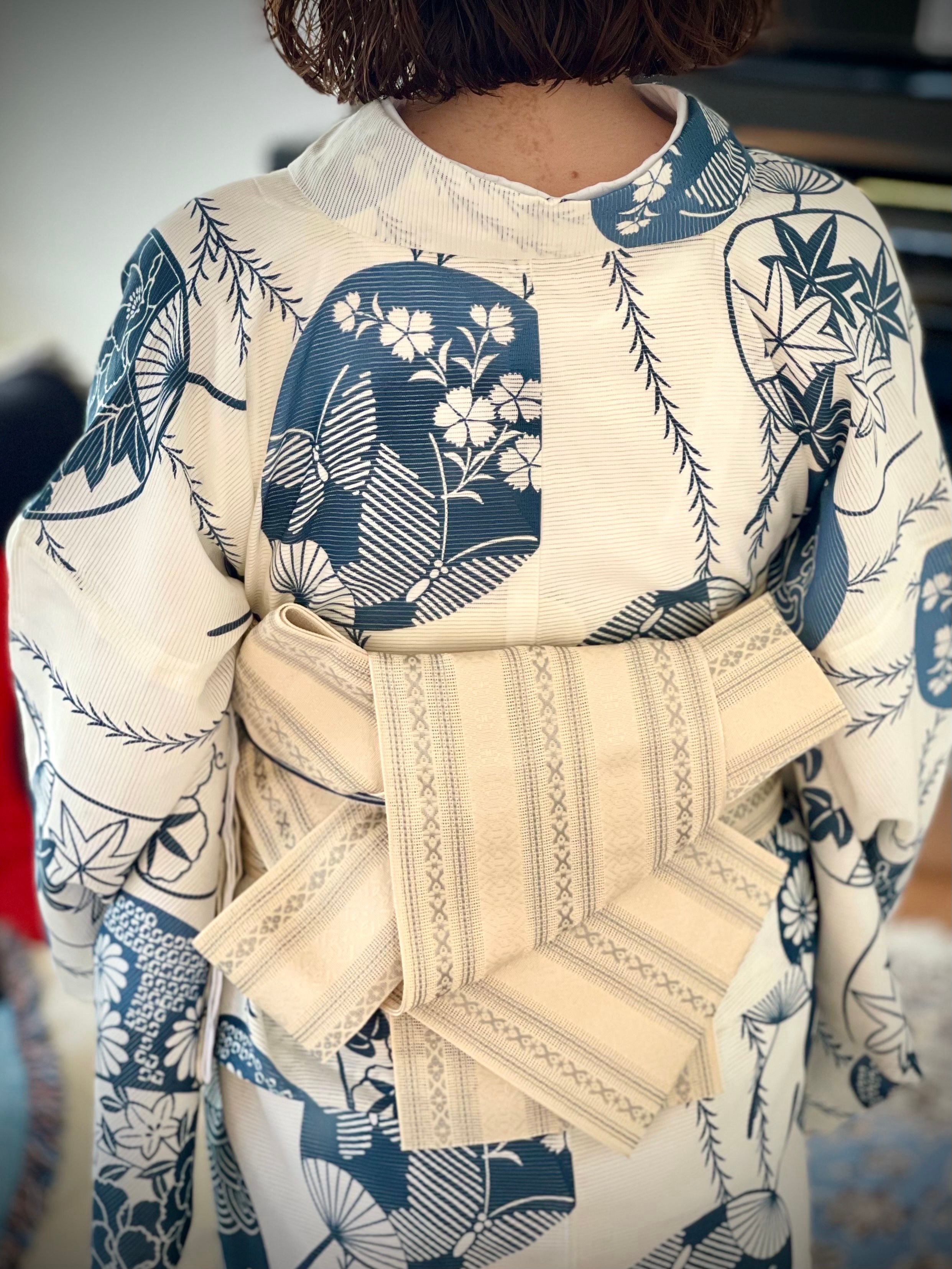 本日の浴衣着付けのお客様。昔ながらの小粋な柄には古典的な帯結びが合いますね。綿絽に紗献上、素敵です🙂