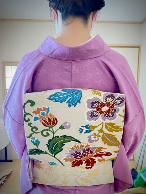 鮮やかな葡萄色の色無地に華やかな袋帯。とてもお似合いでした。