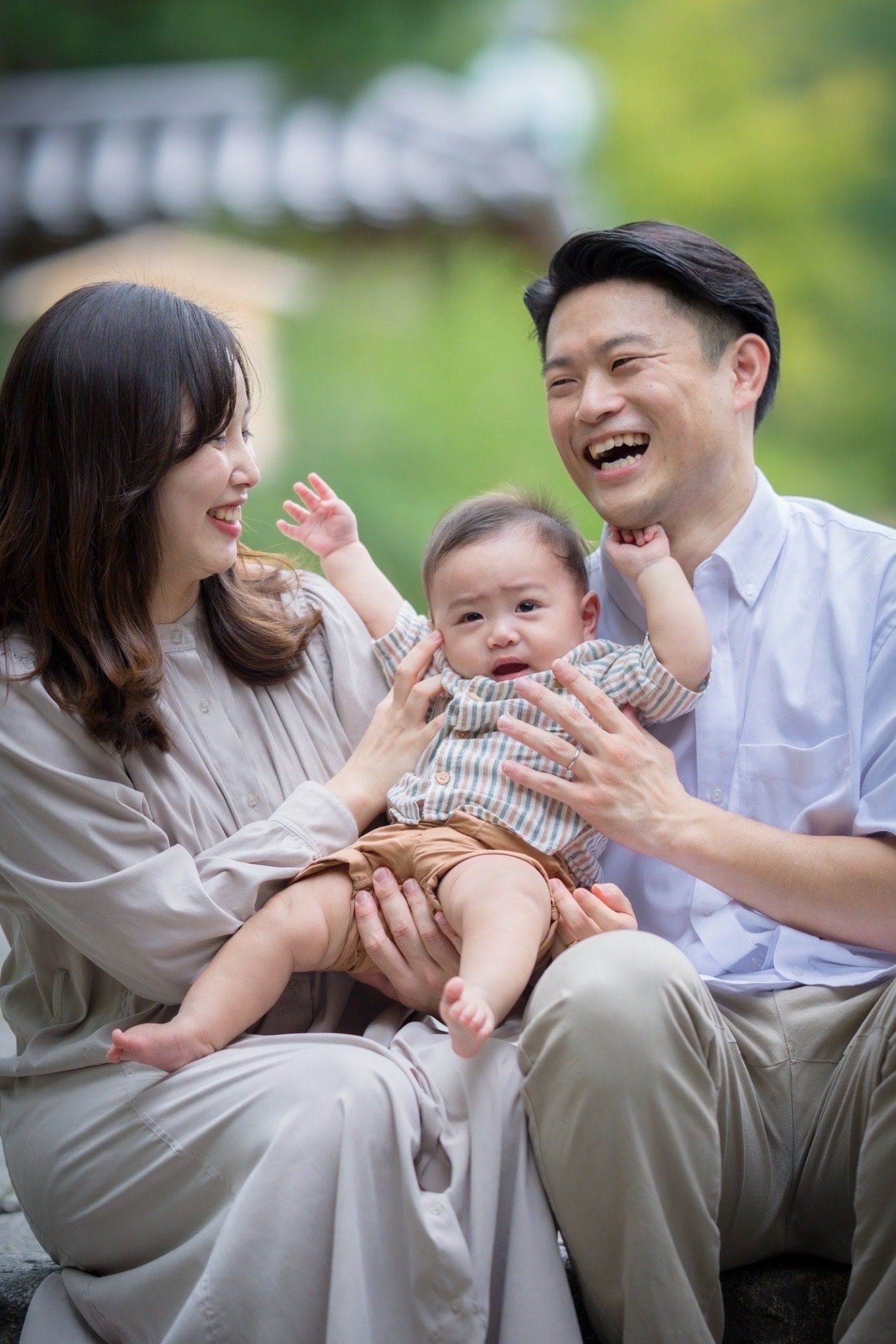 妊婦の時に撮影し、一年後に同じ場所でファミリーフォトを撮りました。幸せがあふれる写真を心がけました。