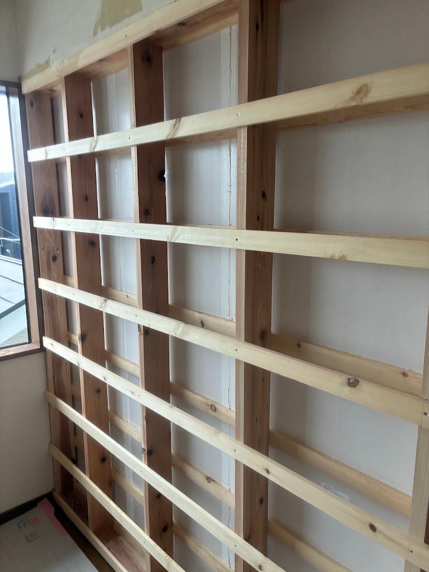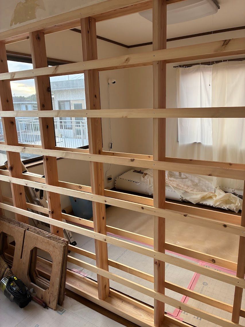 写真をご覧いただくと、新しく組み上げた木材の底がきれいに並んでいるのがわかりますね。これが間仕切り壁の「骨組み」になる部分です。