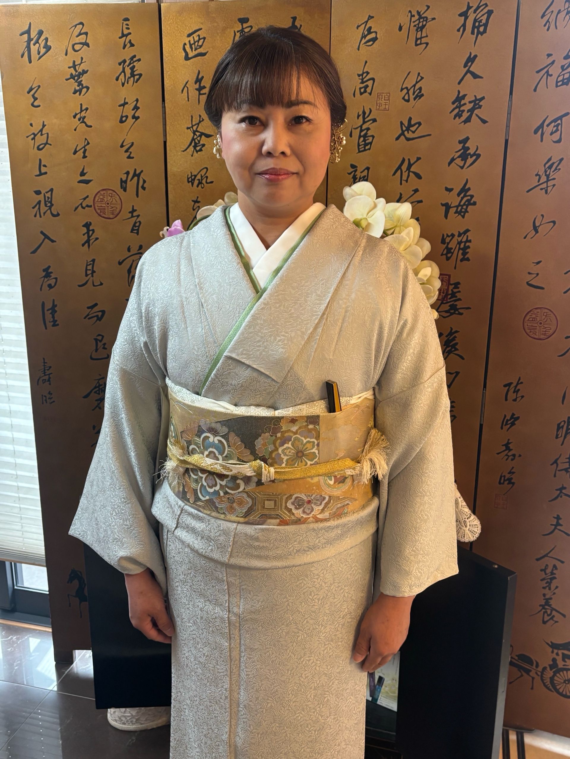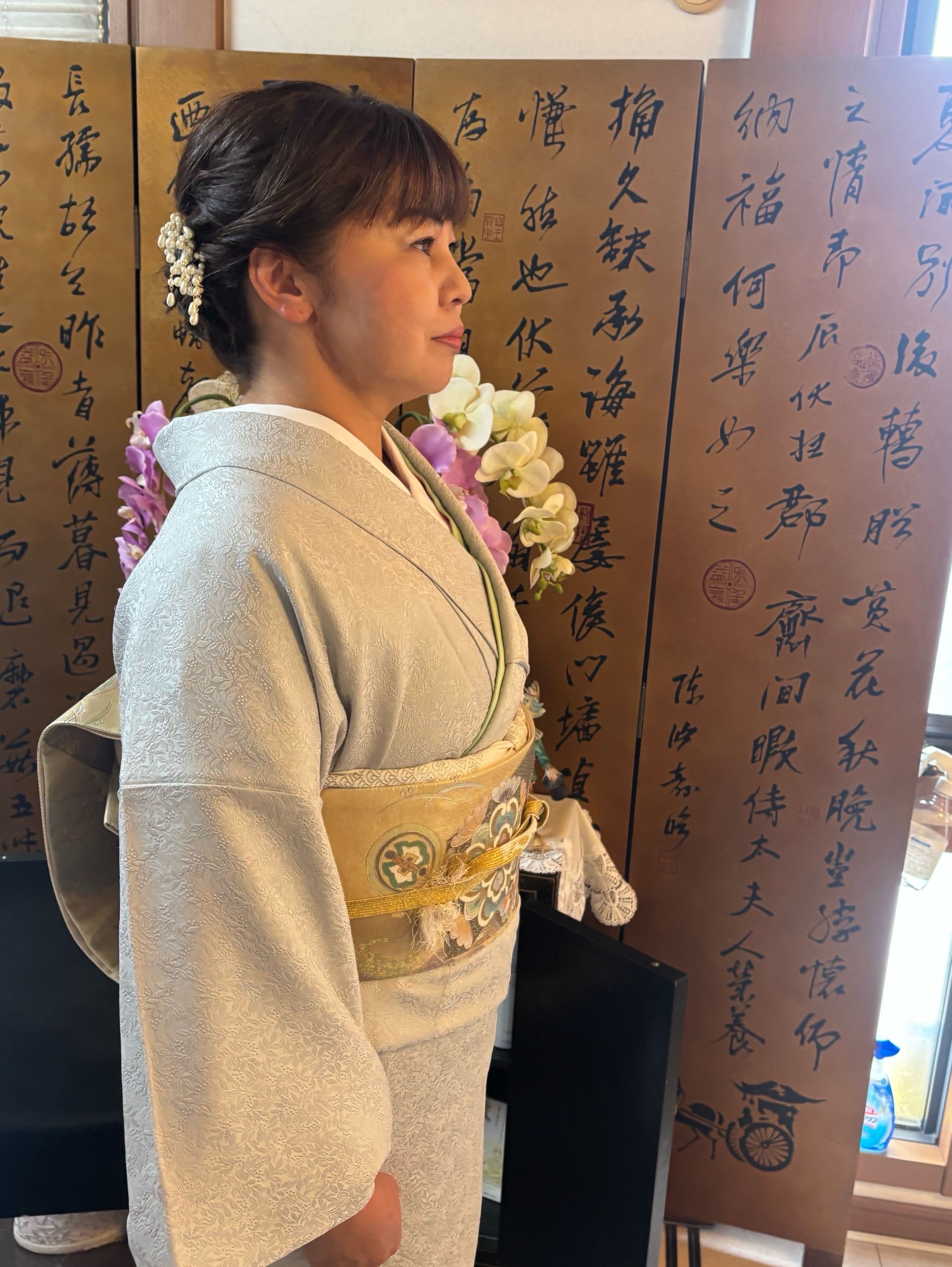三ノ宮の結婚式に御主席の奥様のお着付とヘアーセットをさせて頂きましたご主人とお二人の主席との事でなるべく華やかにスレンダーに着付けて欲しいとのご希望でした仕上がりに満足でした