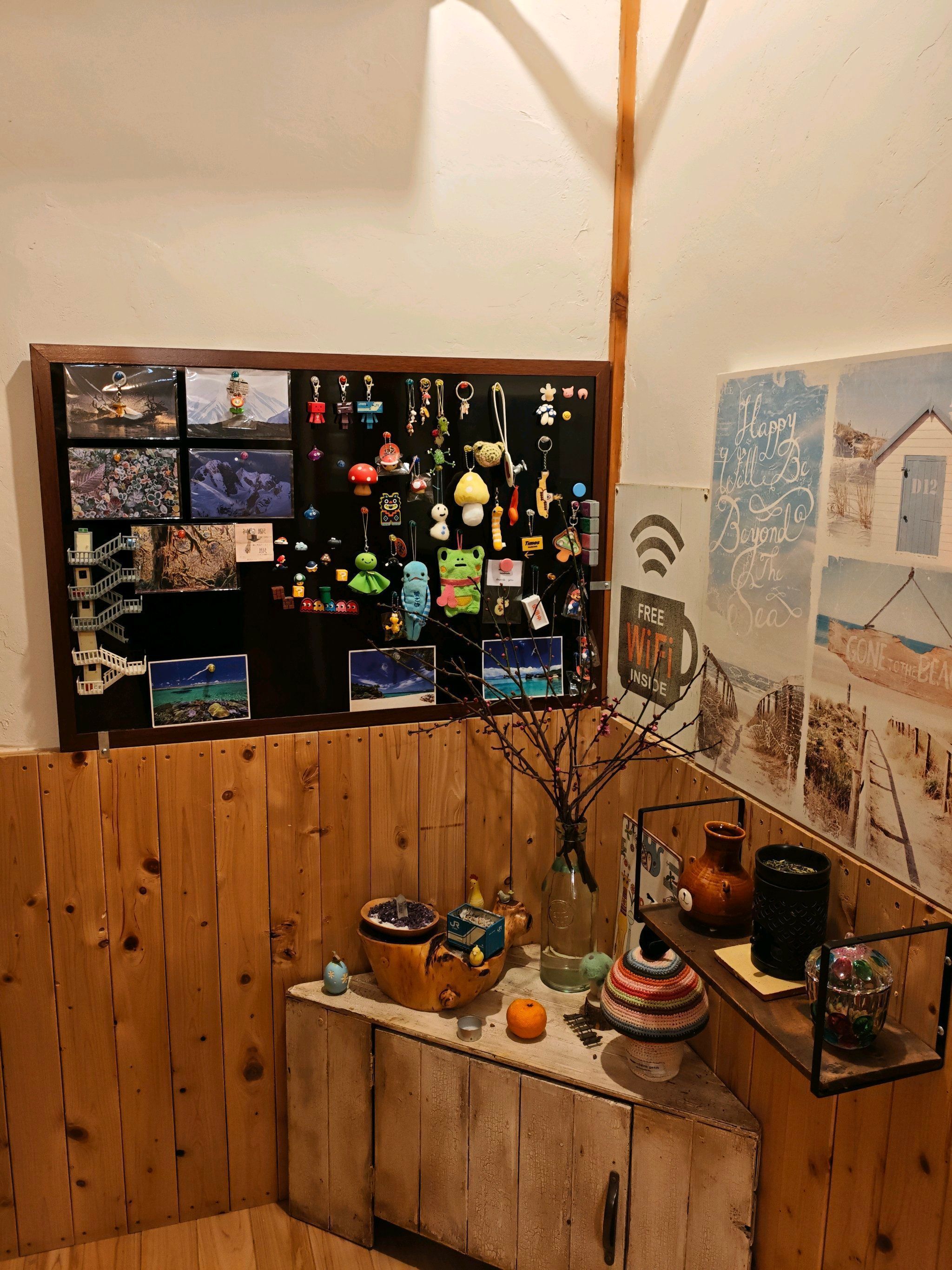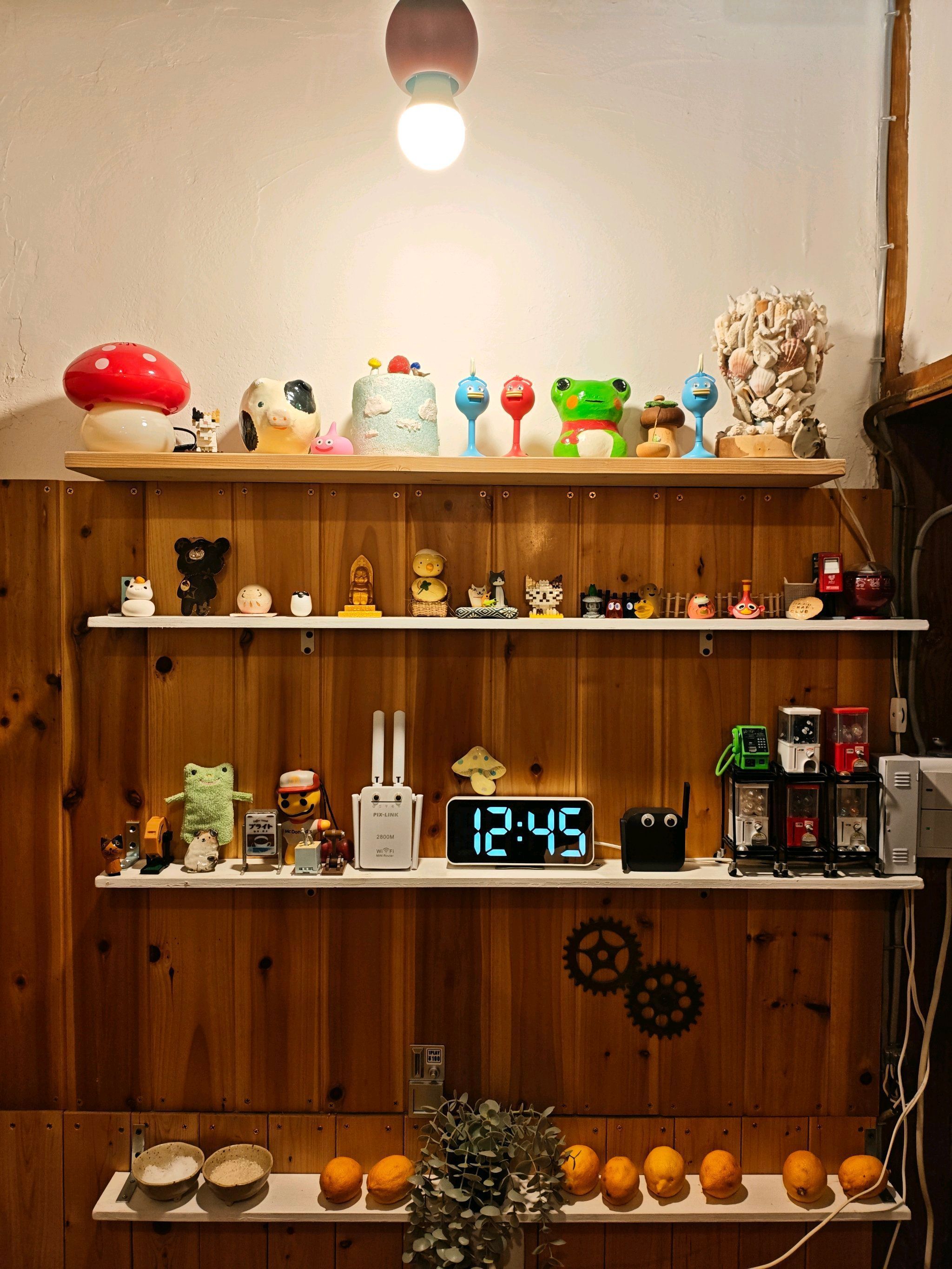 自作のキノコ等、可愛いものを置いたりして、出先で見つけた可愛いものなどを置いたりして、少しづつ、良い場所に。