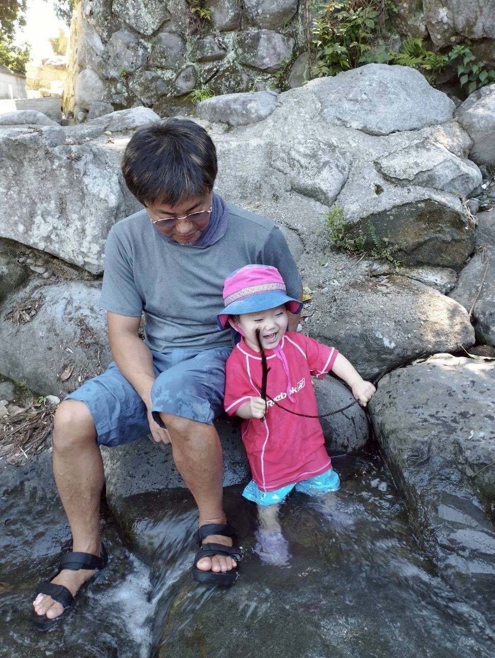 今日は誰もいない近くの公園で、ワンコと子供と足を水に浸けて涼みました。