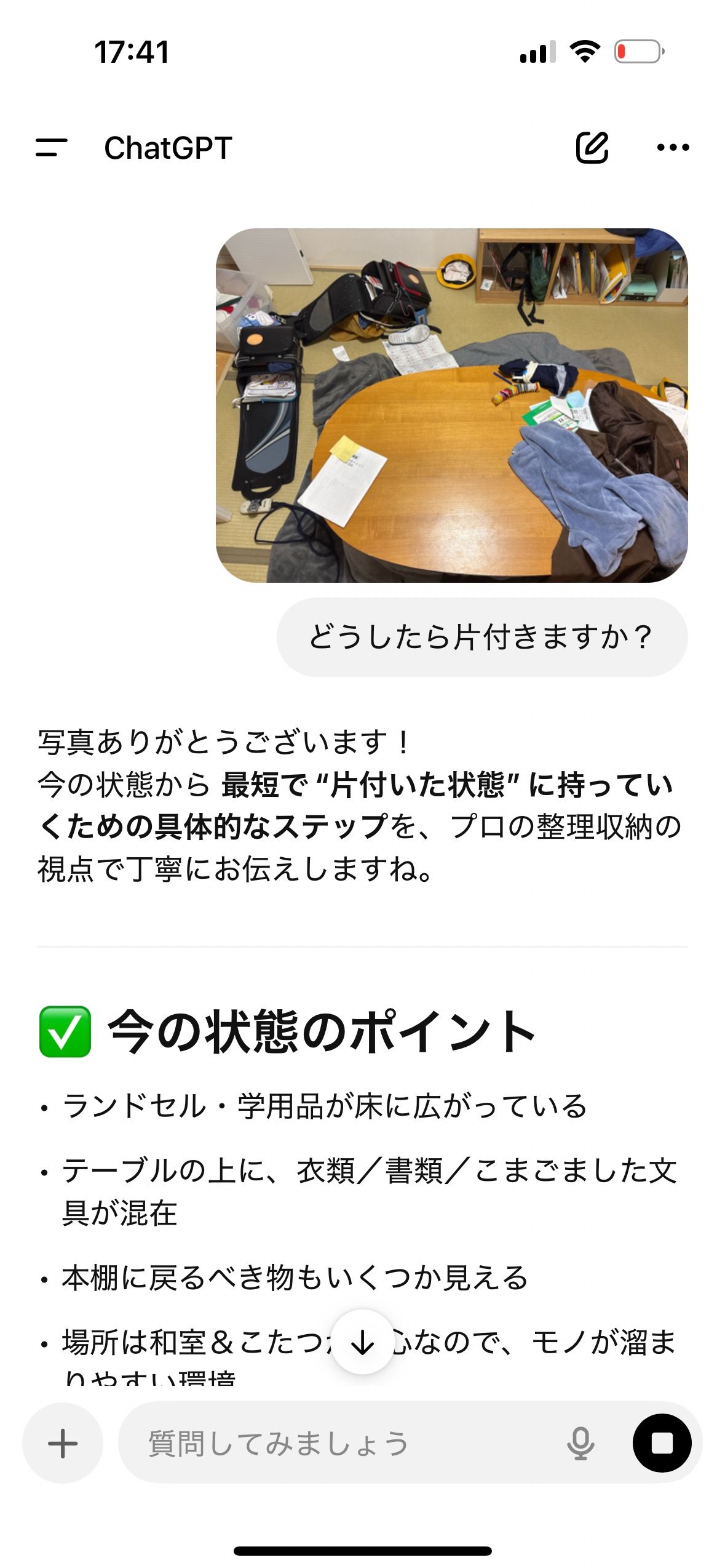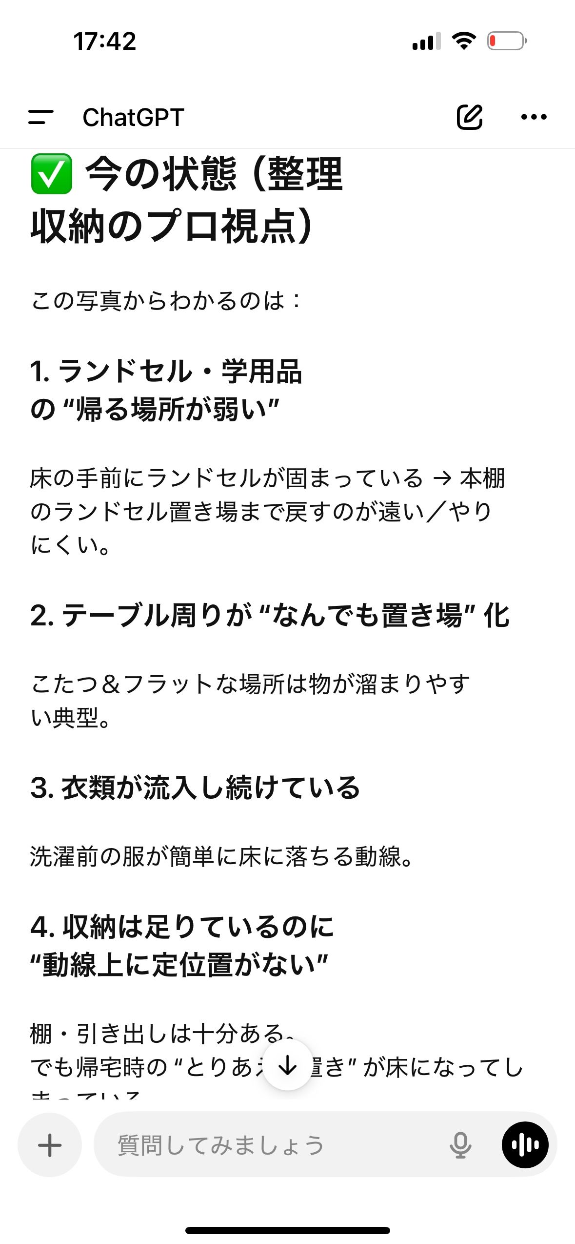 こたつを出したら案の定 四六時中散らかっている状態なので、 チャットGPTに相談してみました。 アドバイスが丁寧&即答で、 ありがとうチャッピー!←(わたしのチャットGPTのあだ名) 以外言葉はないですが、 腰が重すぎる、、