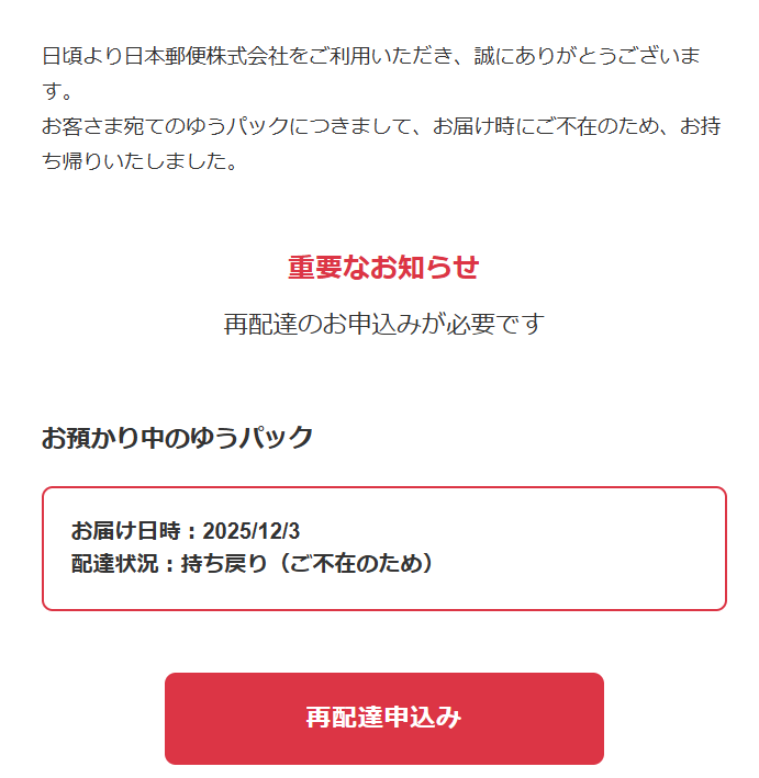 再配達の指定を下記リンク先よりよろしくお願いします。