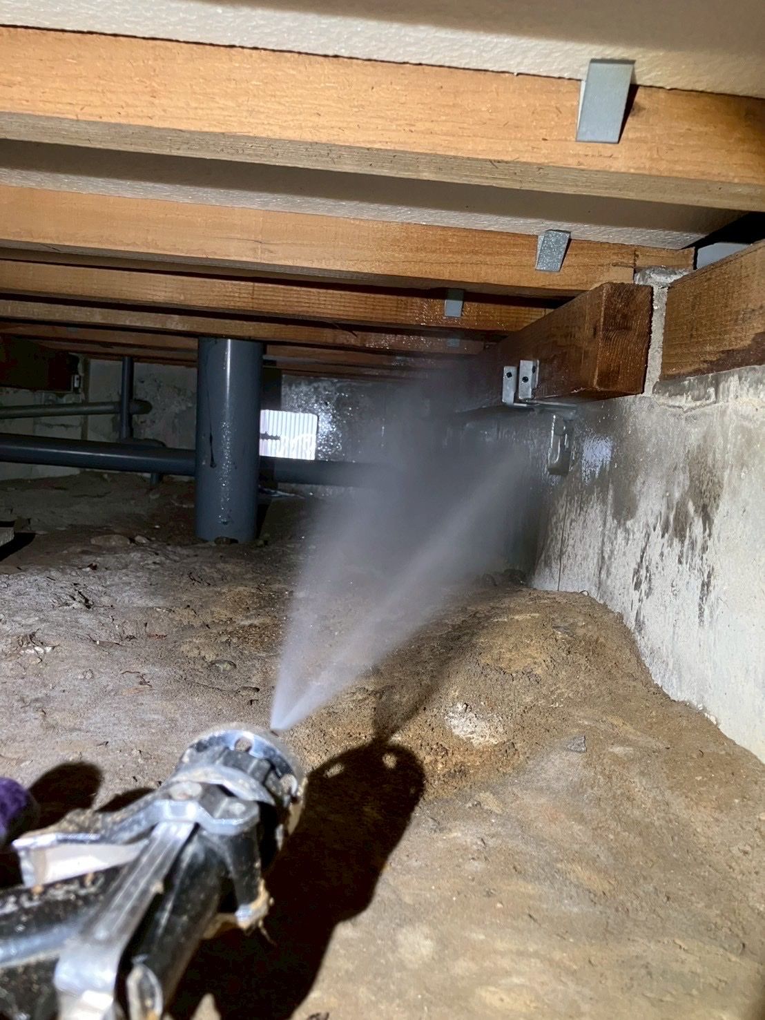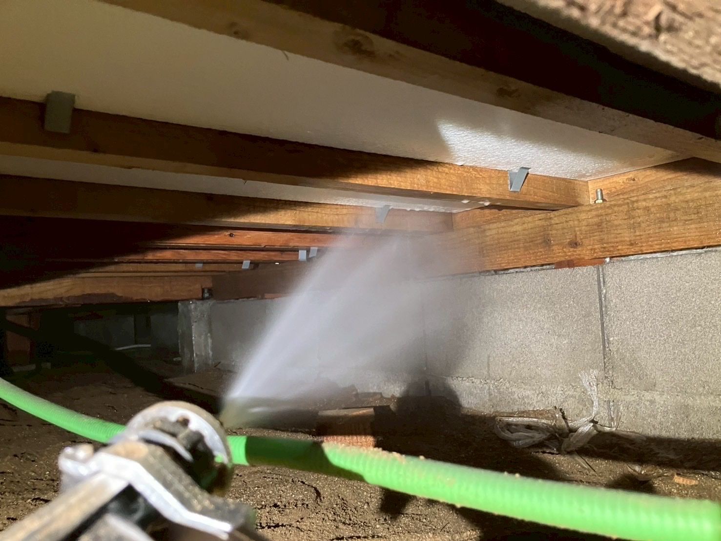 床下に潜り奥からシロアリ用薬剤を散布いたします。