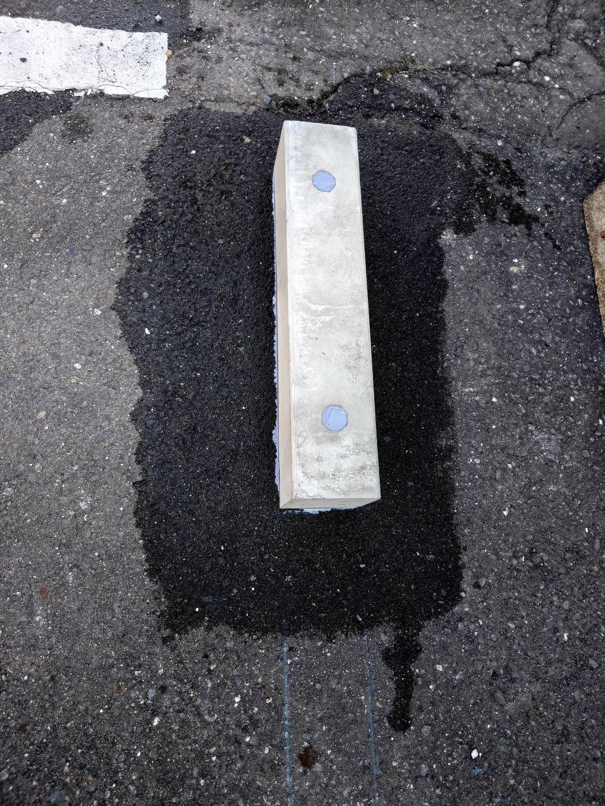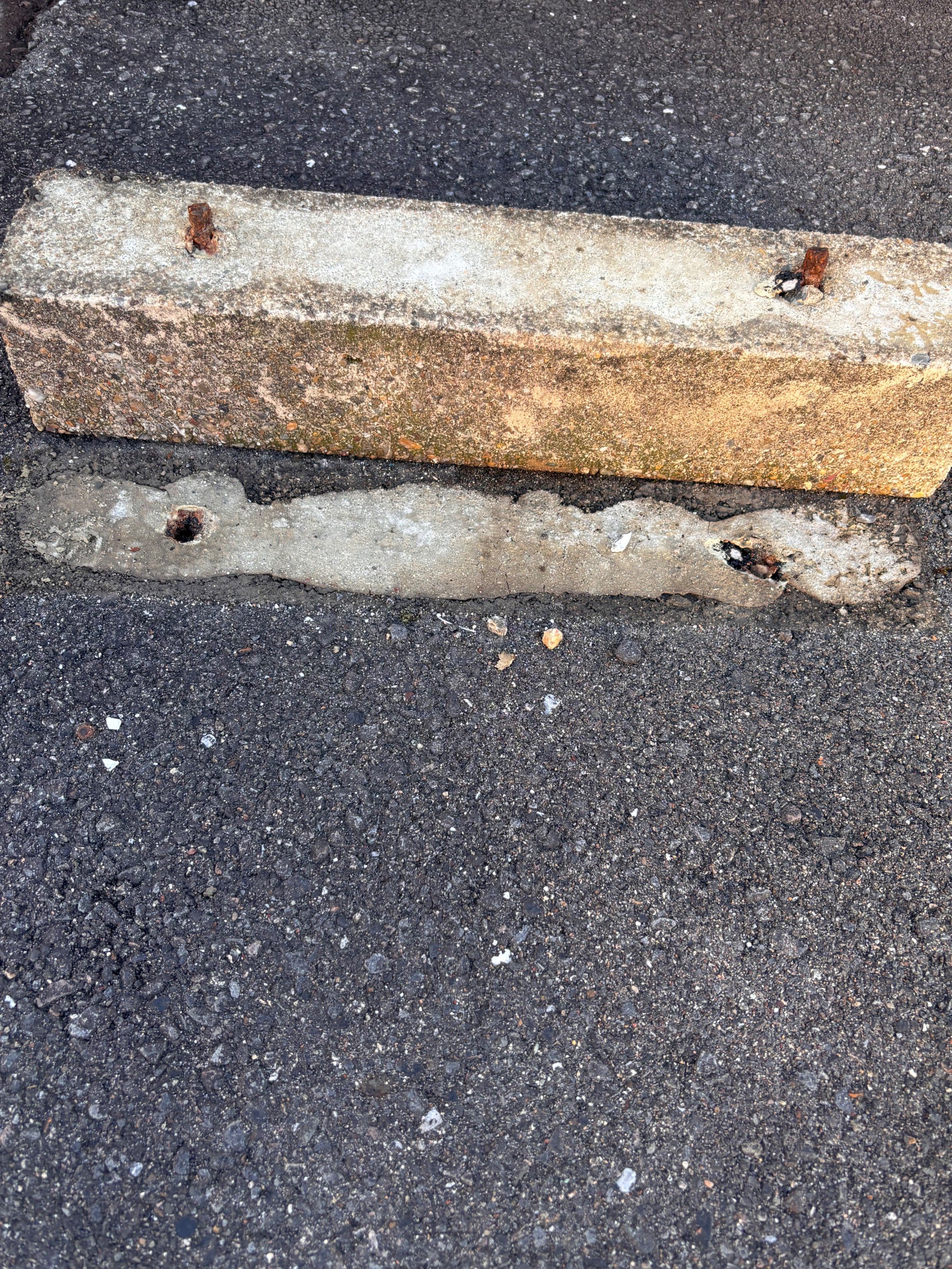 既設ブロック再利用も外れ方によってはリサイクルできますが、アンカー穴がコンクリート巻でしたのでコンクリート除去しても本体の駐車ブロックが割れてしまう可能性がありましたので新規ブロックを提案させて頂きました。