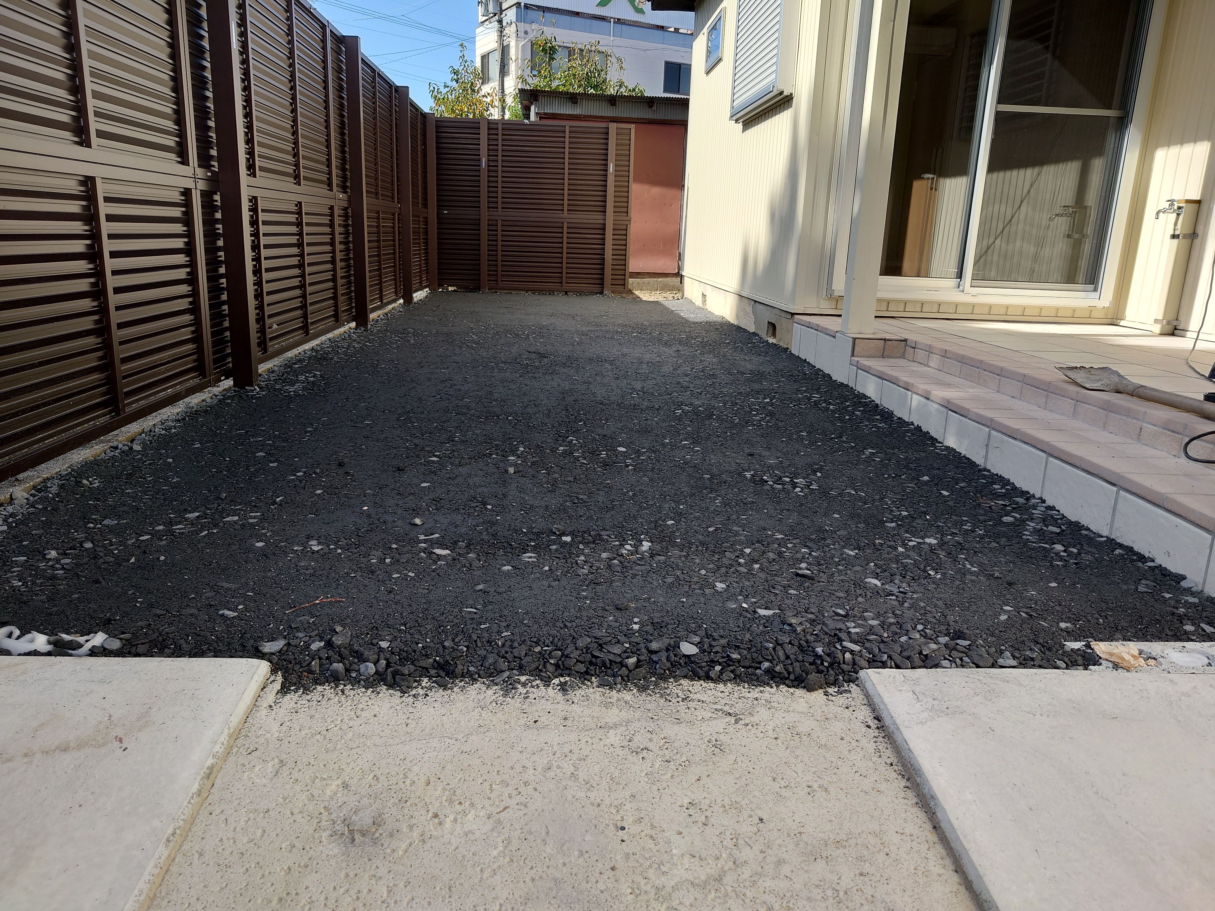 景観用ではなく車が乗り入れることがご要望でしたので山取り砕石(黒)を提案させていただきました。