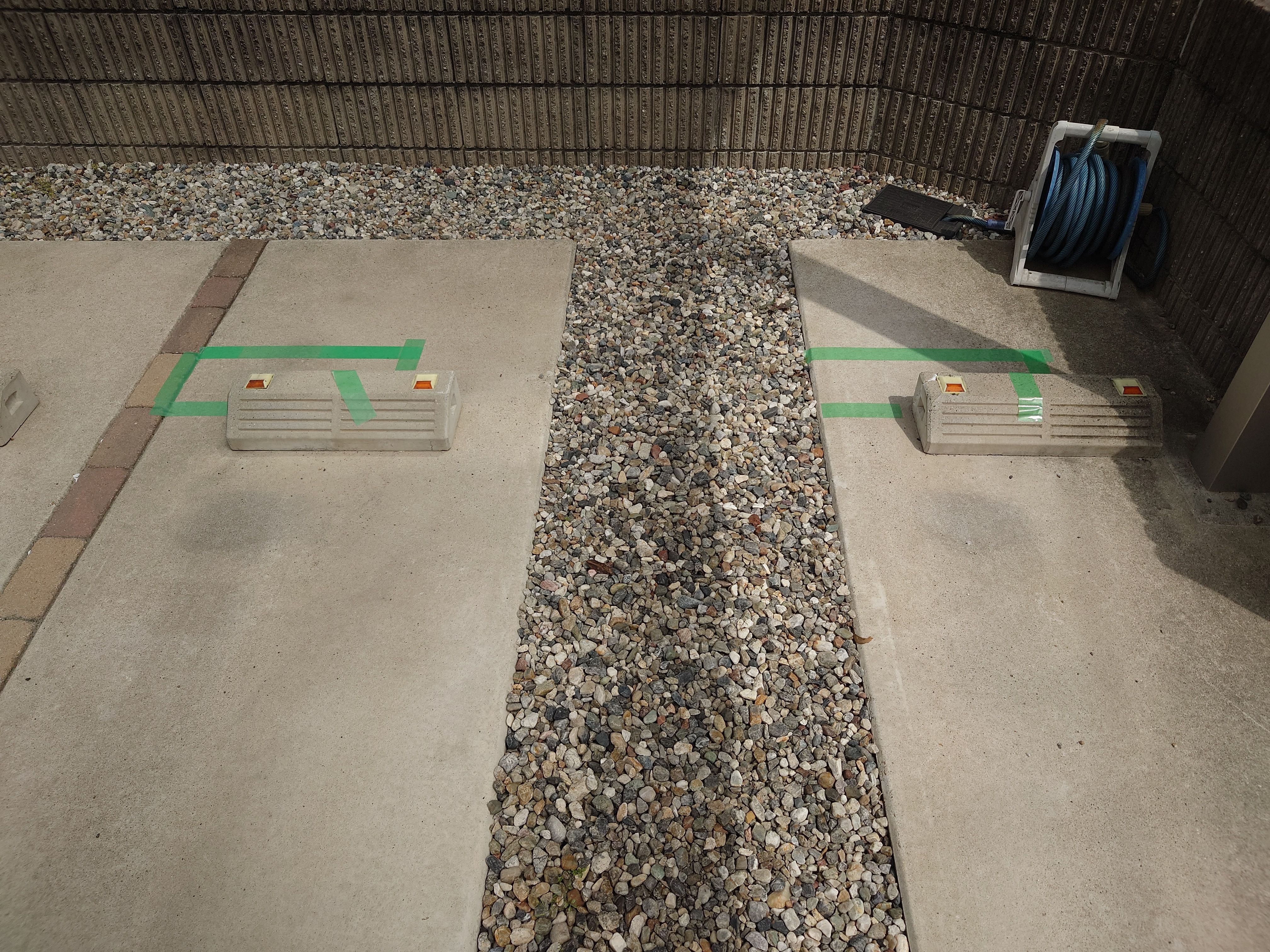 本日の御依頼は新しいお車が納車されるということで今の現状の駐車ブロック位置だと車が道路にでてしまい停めることができないということで、既存の駐車ブロックを撤去し、新規ブロックの設置になります。