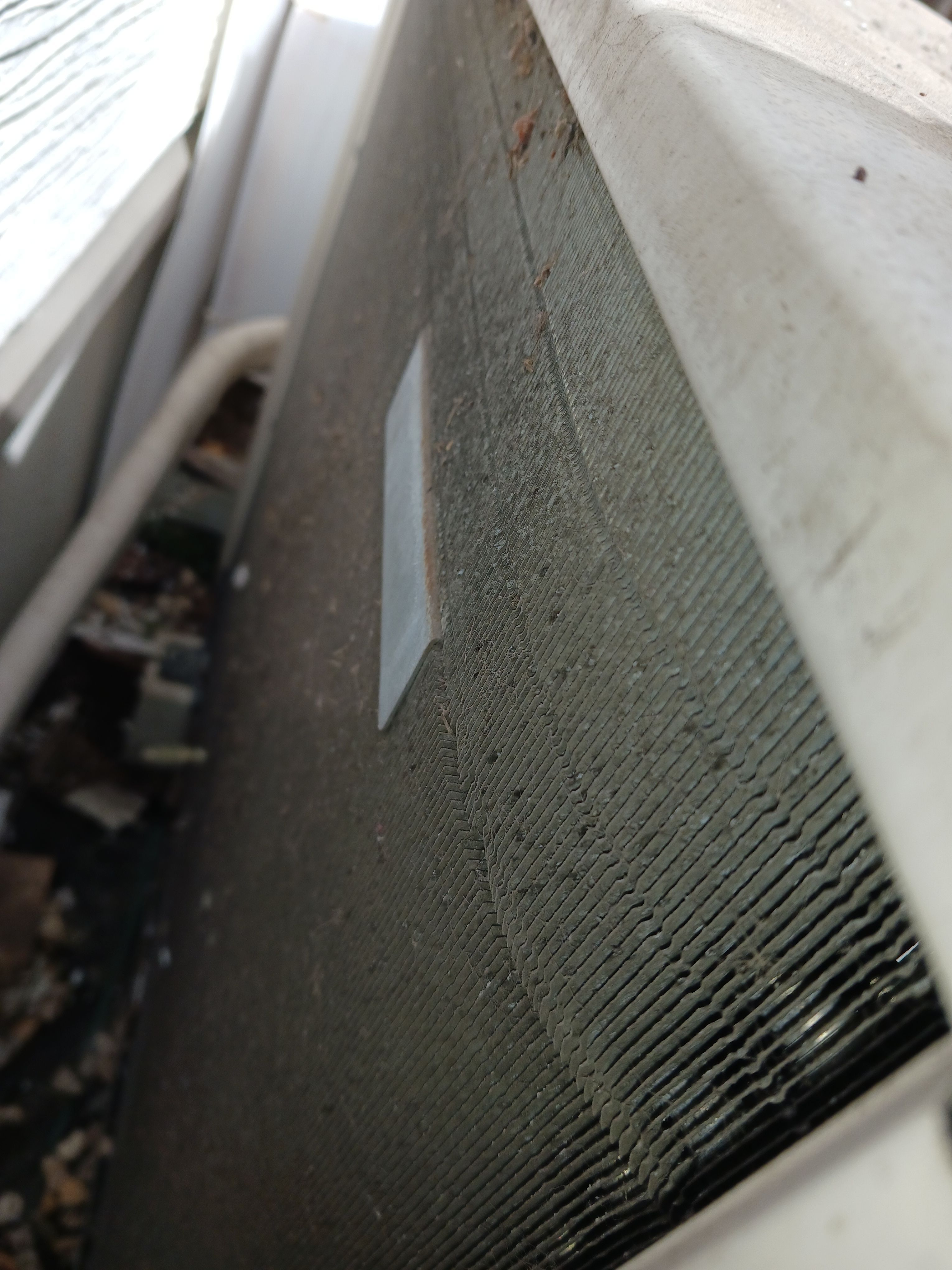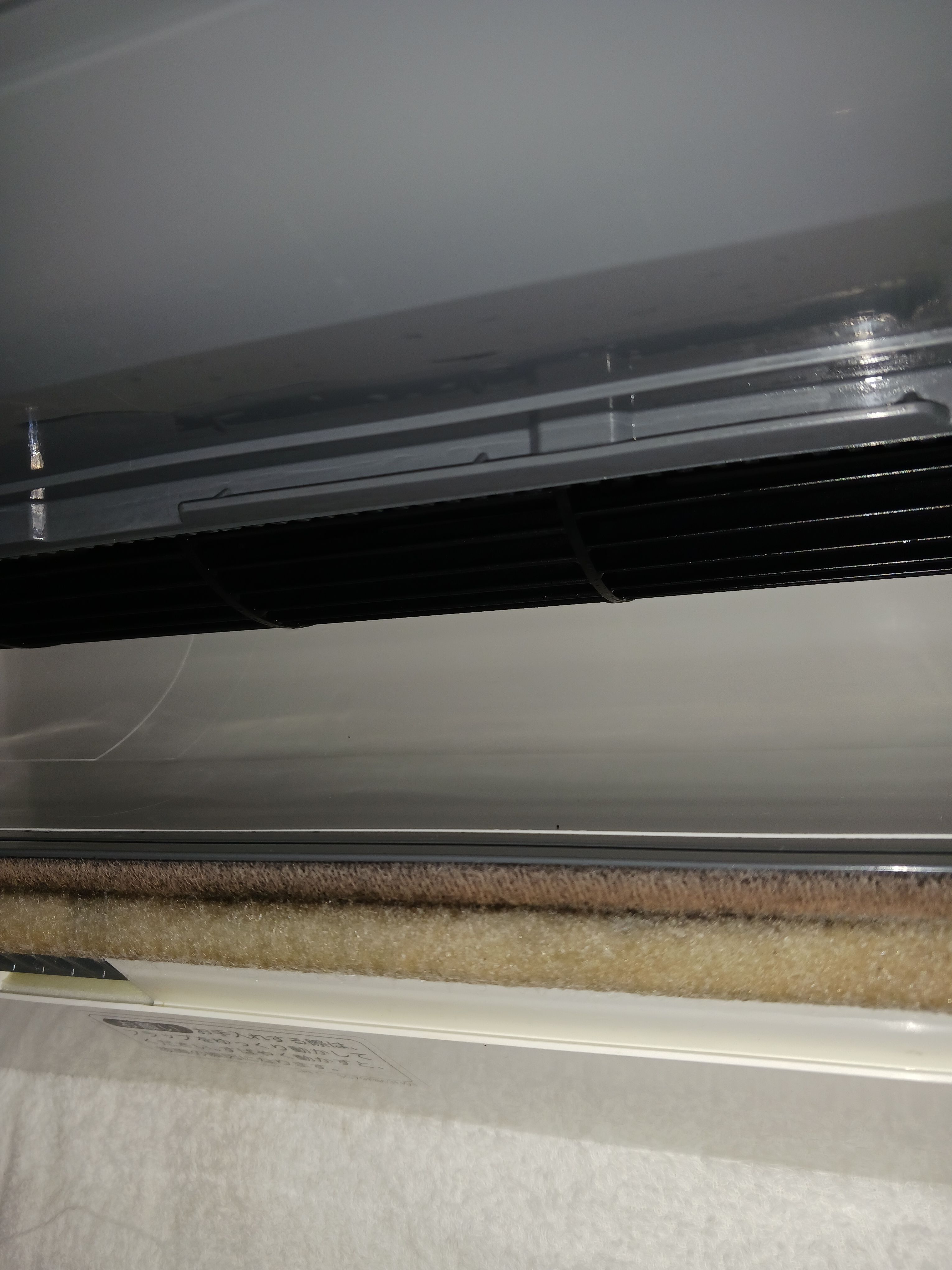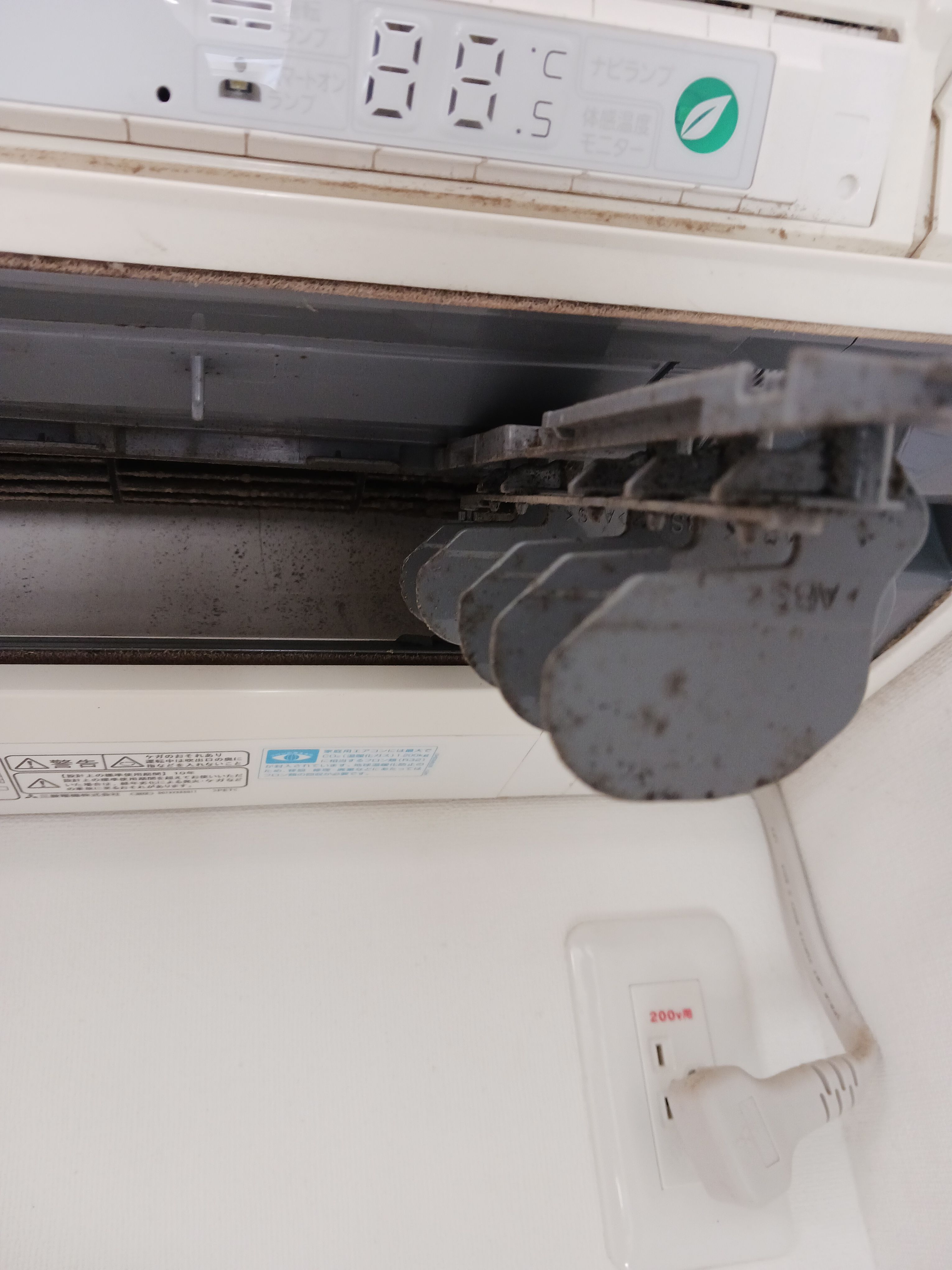 三菱は、左右風向板が開いてくれるんで掃除しやすいです。室外機の裏も見てください。掃除します。