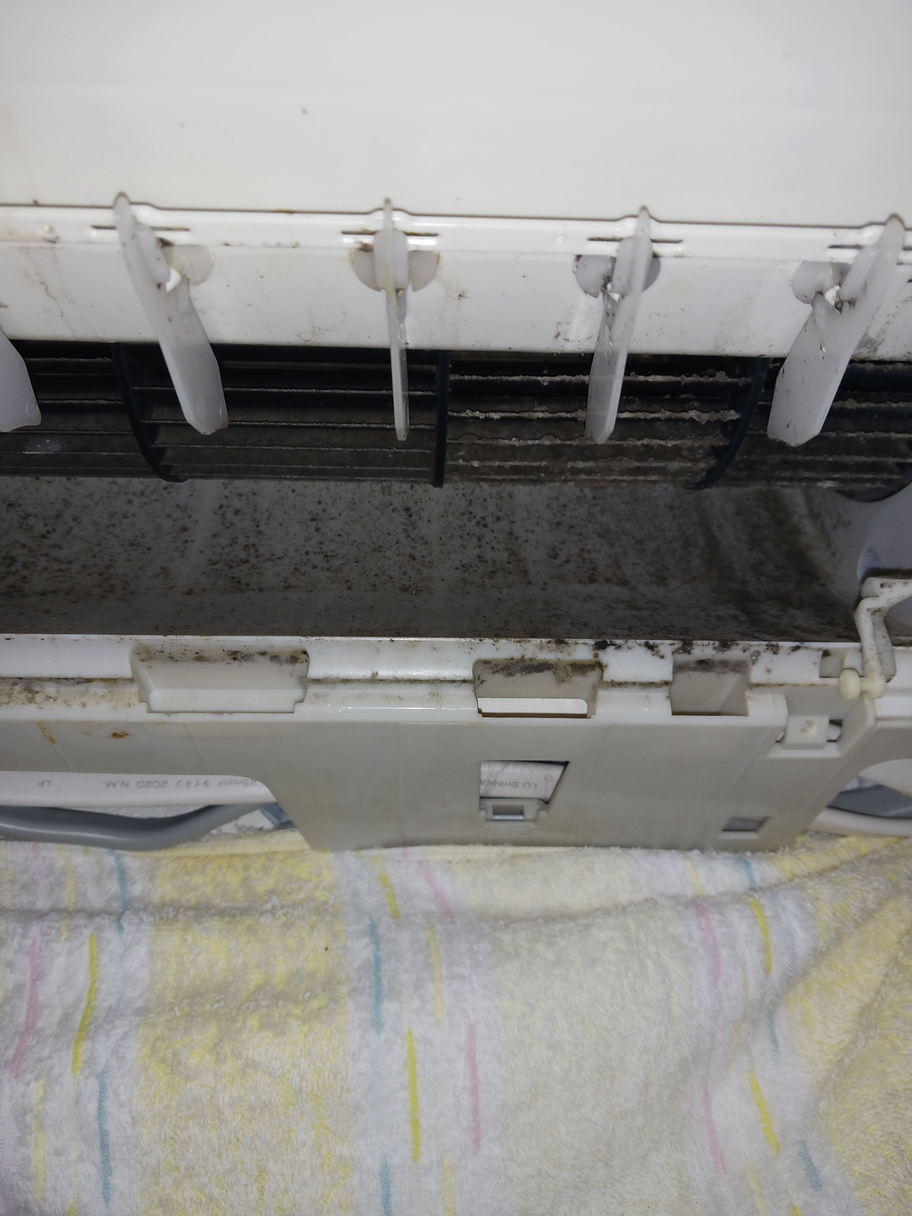 かなり大きなエアコンです。しっかり冷暖房してくれます。掃除機能があっても汚れるんです。しっかり時間をかけて綺麗にいたします。