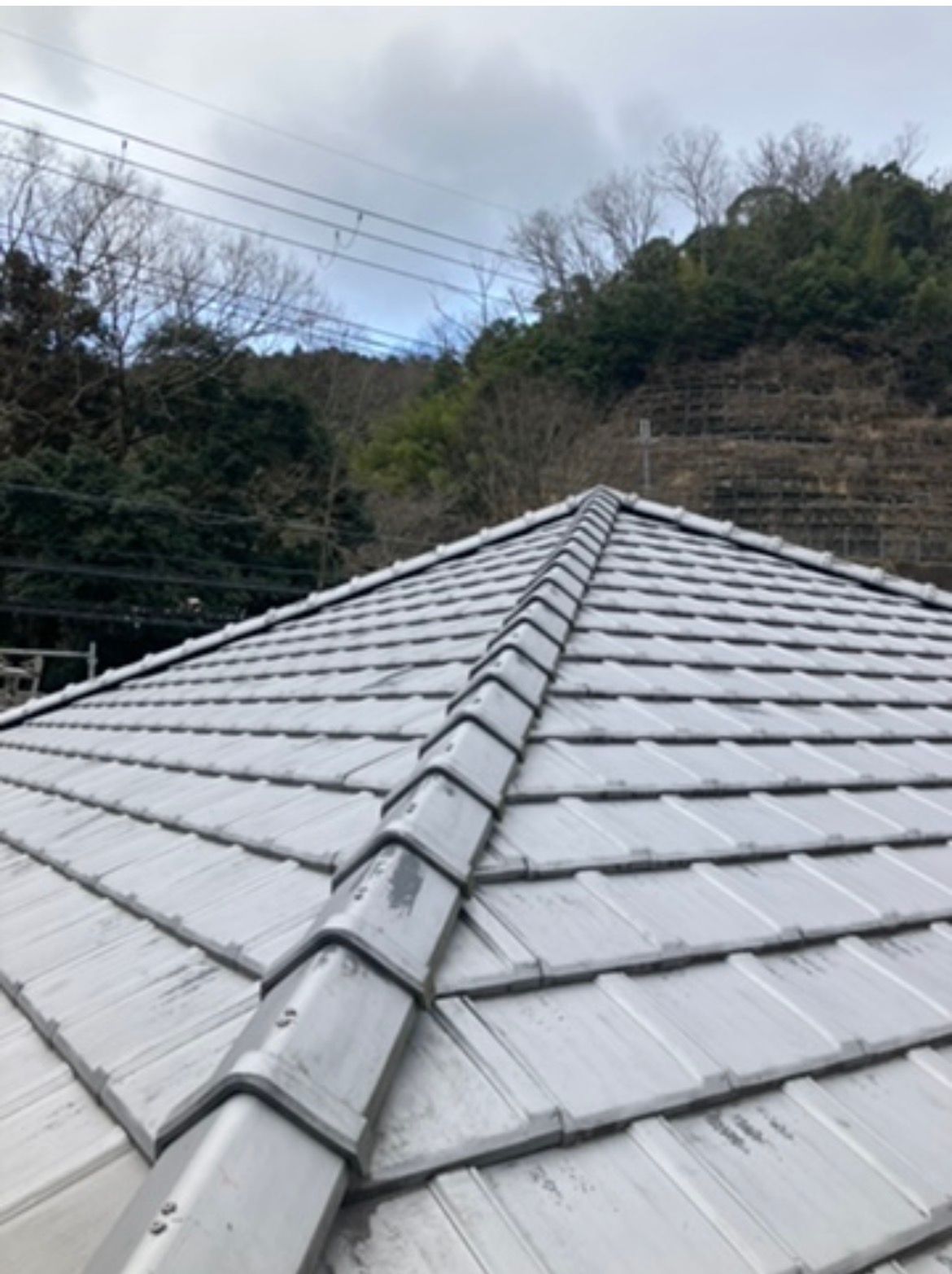下市町で平板瓦のの近くの三角瓦が落下していると言うことで調査依頼いただき拝見しましたら、三角瓦をビスなどで固定してないのが原因でした。棟の瓦は再利用で三角瓦の固定をし 乾式工法のハイロールを使って伏せ直しさせていただきました。これで安心して生活していただけます。
