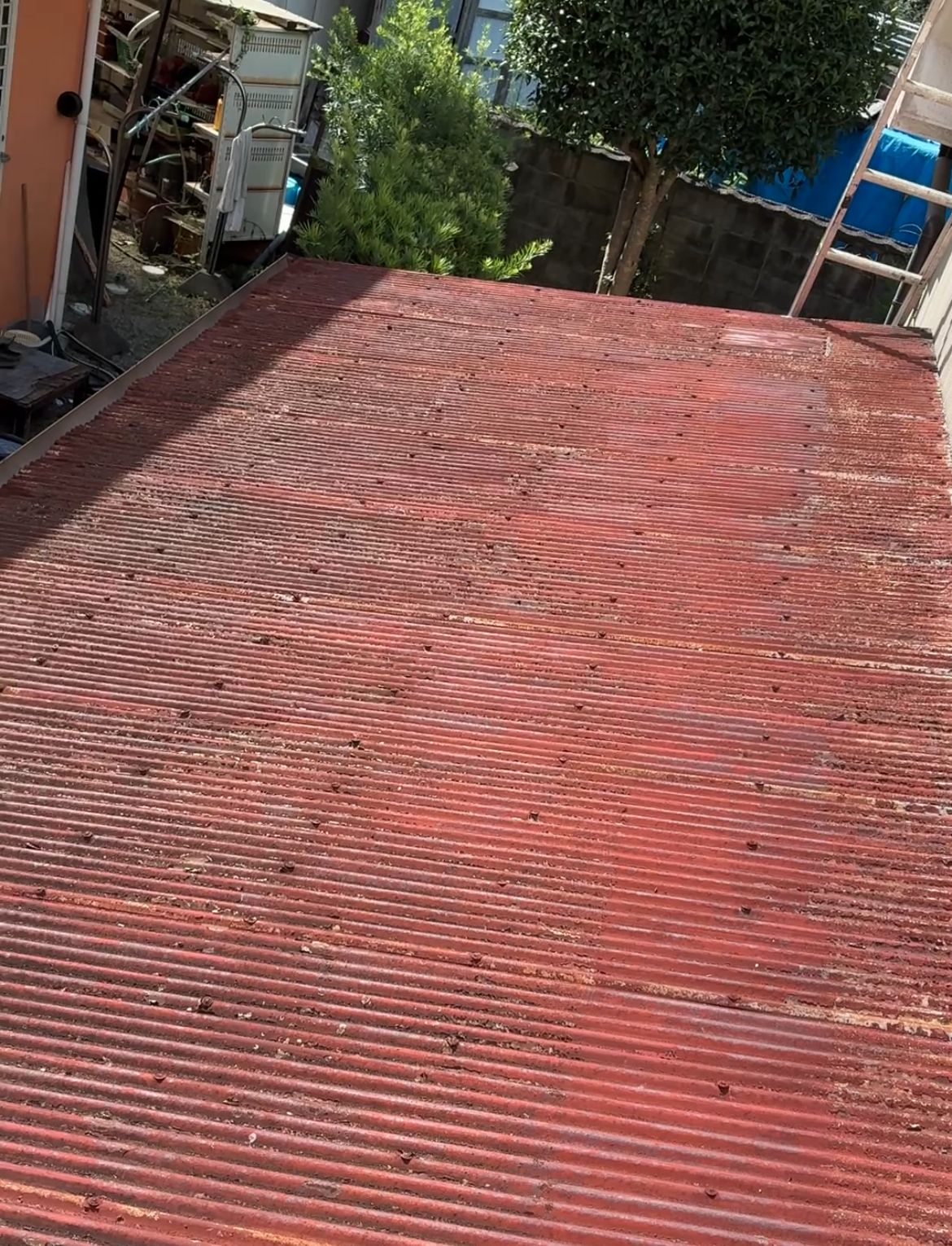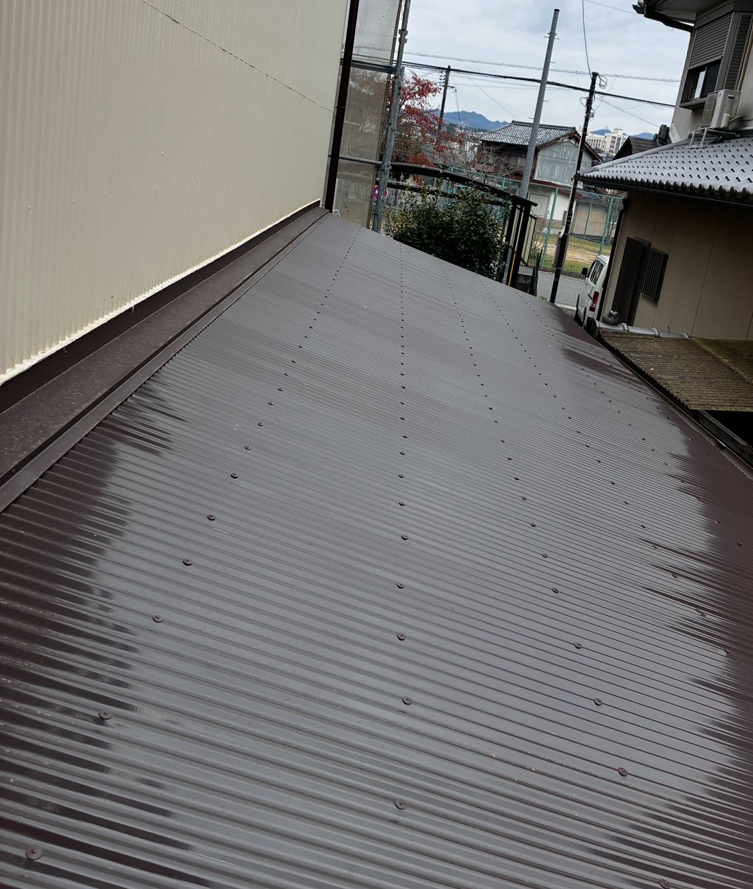 錆びている波板は一旦外して、新しい波板を施工し、雨抑え板金と壁の色と同じアイボリーのコーキングで雨仕舞いさせていただきました。