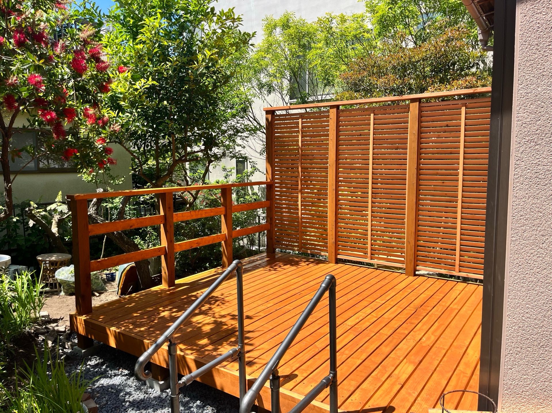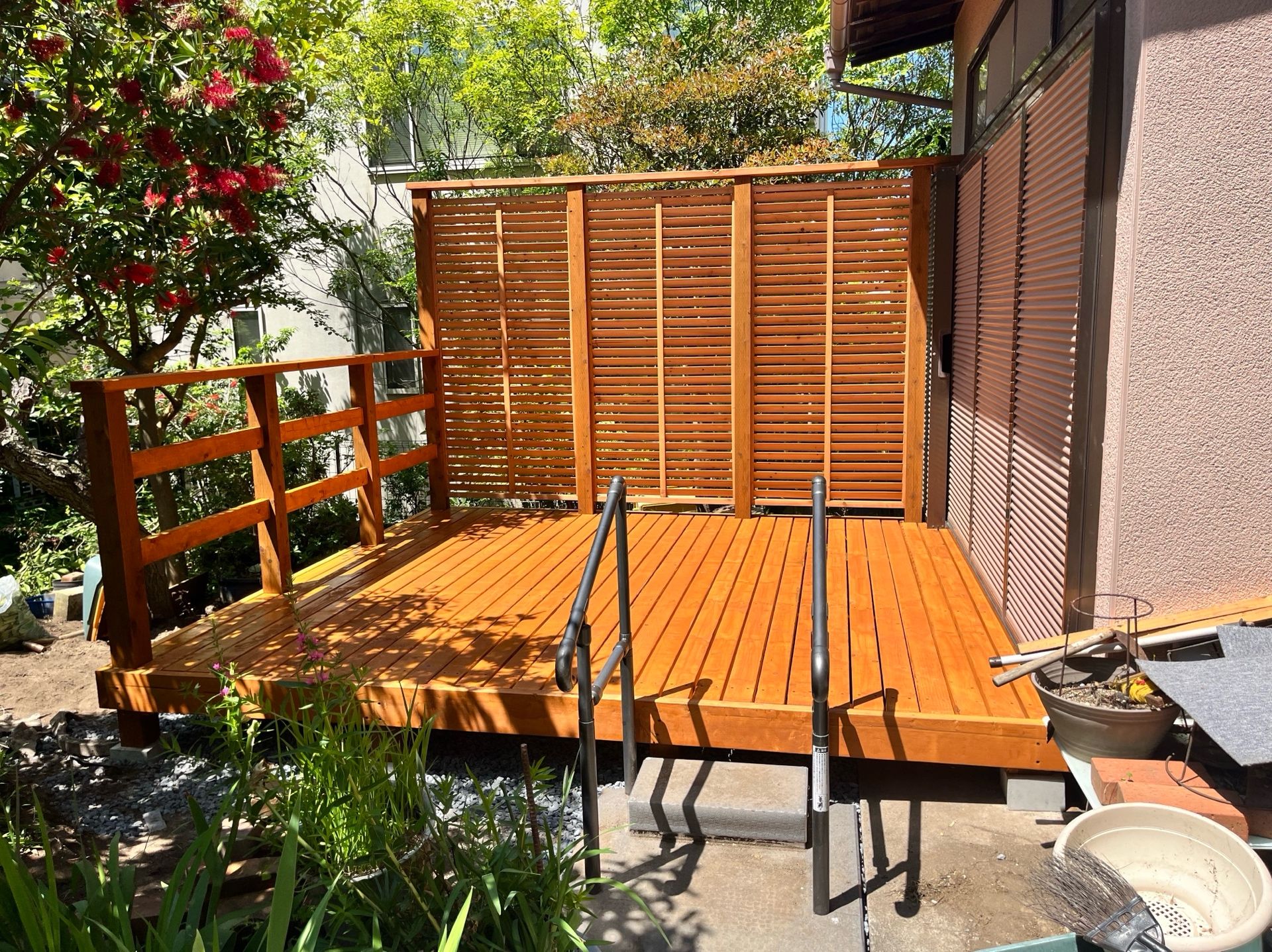 藤沢に居る顧客様からトイレ工事、外壁塗装工事ご依頼いただきましてそこから定期的にお顔を見せに行った際、庭にウッドデッキを作りたいとご依頼いただき作らさせていただきました。予算に限りがありましたがそこは少し赤字覚悟でしっかり良い物を提供したいと頑張りました!オシャレかつ高級感をテーマにラティスを使用しました!!