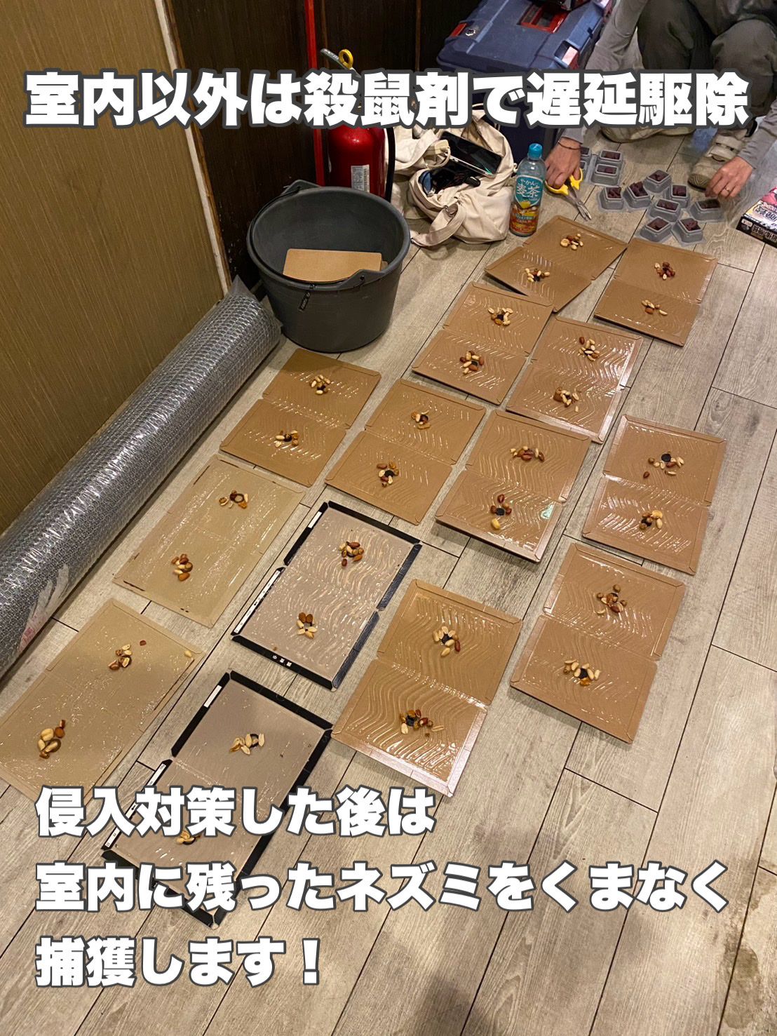 まずは増えすぎた頭数を減らす為いっきにトラップをしかけていきます。お客様の要望や予算に合わせて1番良い方法を提案させて頂きますのでお気軽にご相談ください!