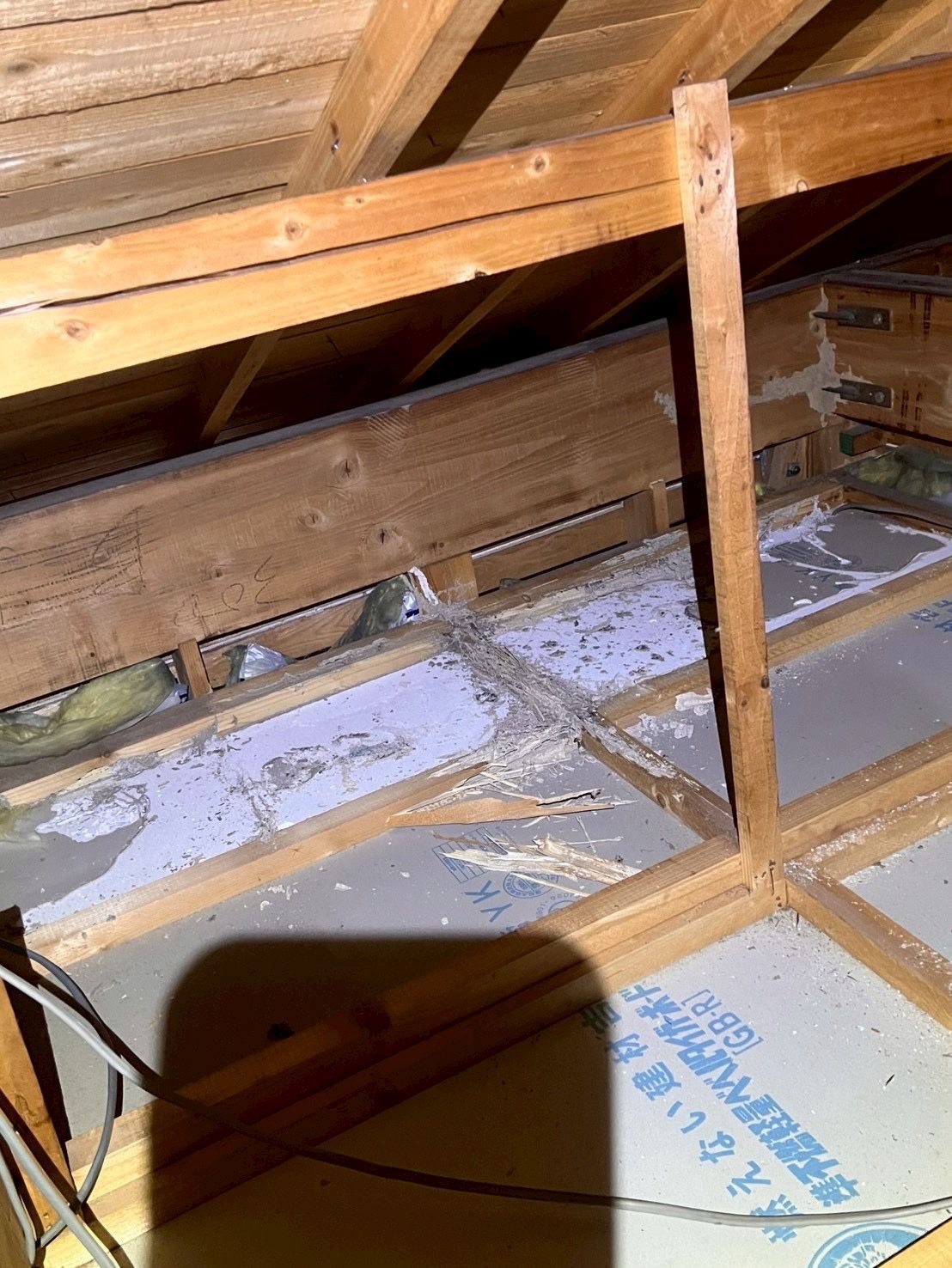 屋根裏まで被害が進行しているため屋根裏補修及び屋根基礎の葺き直しとなりました。水漏れの原因を完全に直すため全て一度剥がしてから再施工していきます。※雨漏れや屋根破損なども全て対応してますので気になる事がありましたらお気軽にご相談ください!