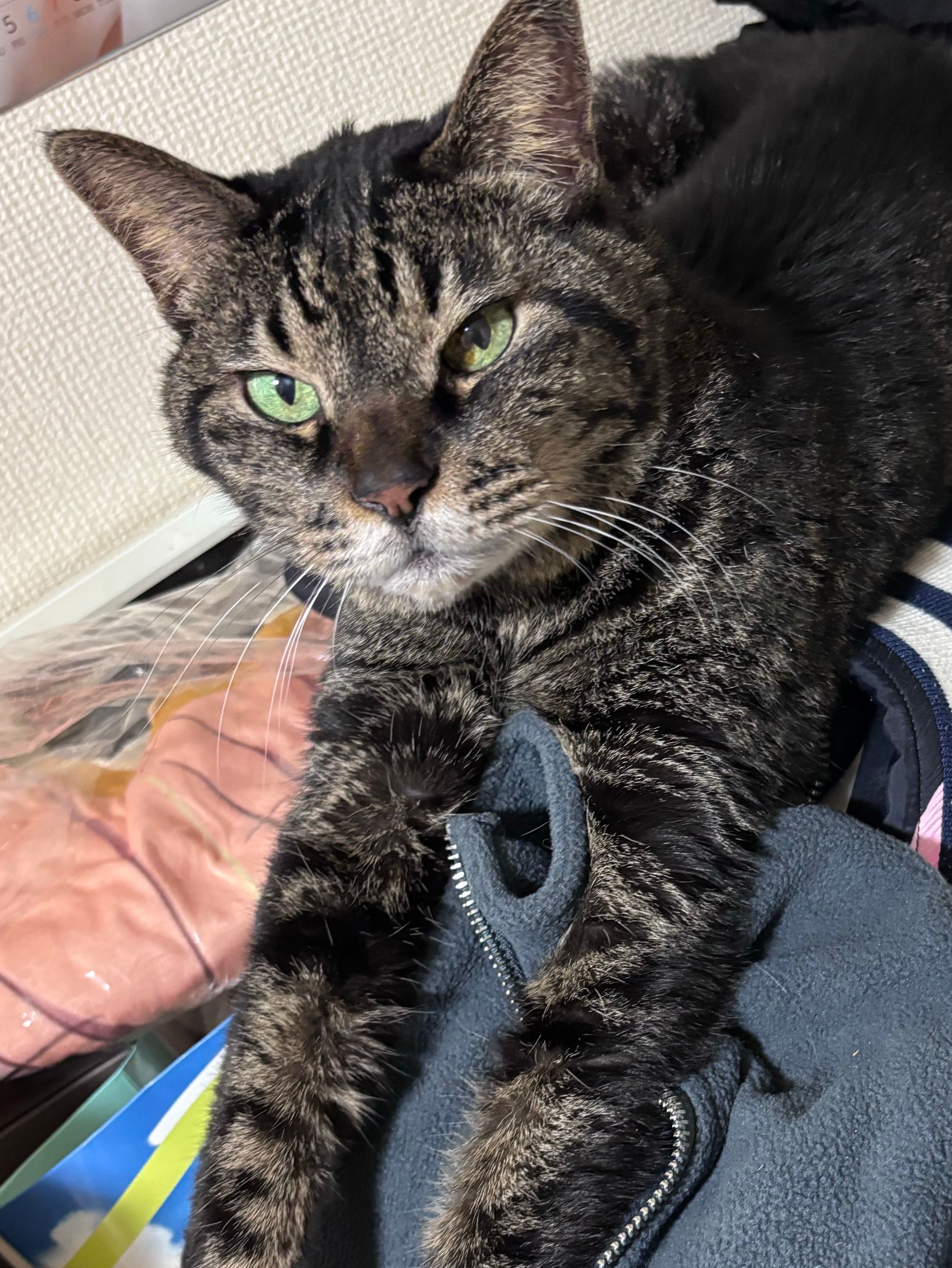 主人の洗濯物の上で寝るマコくん16歳