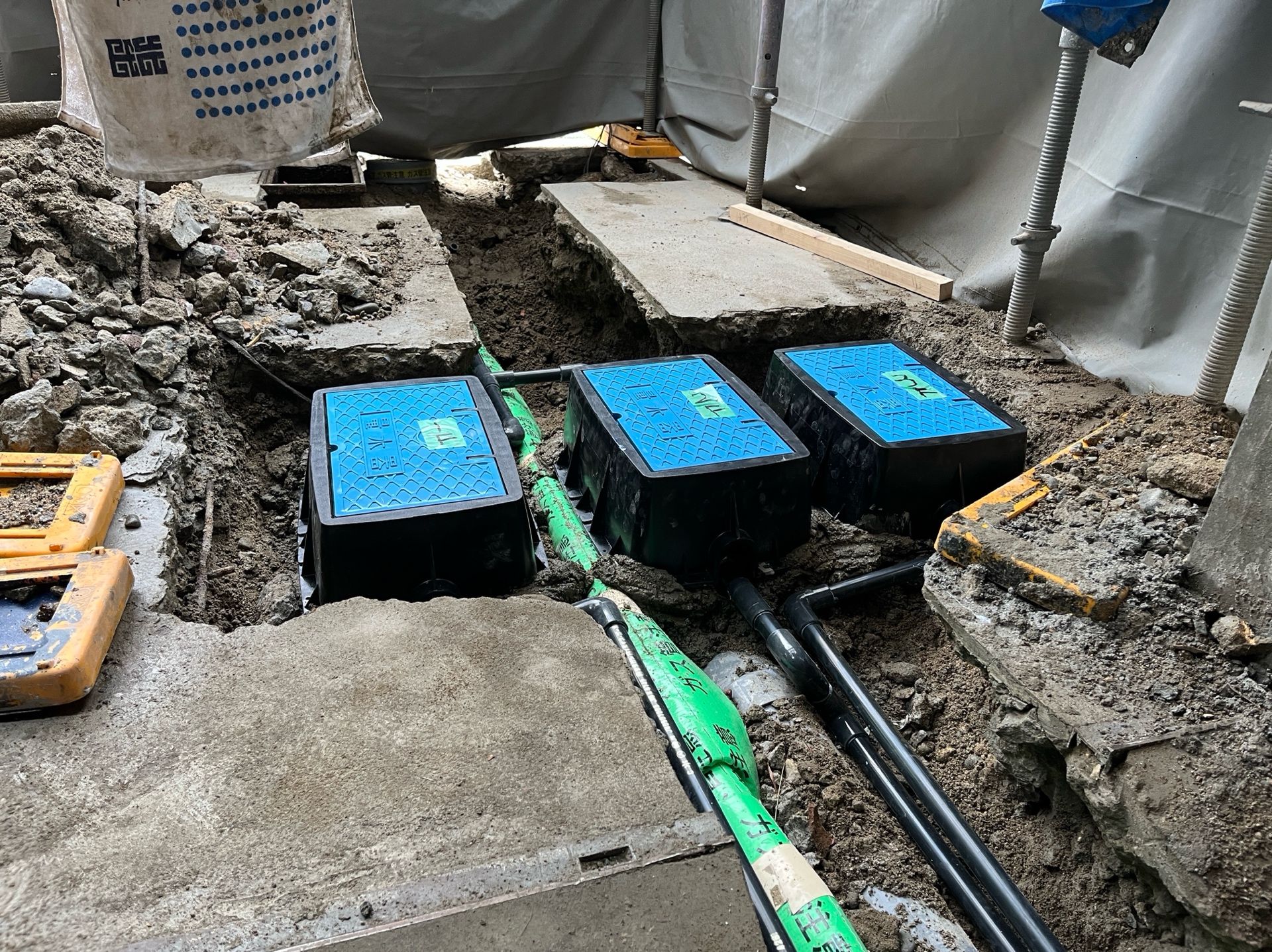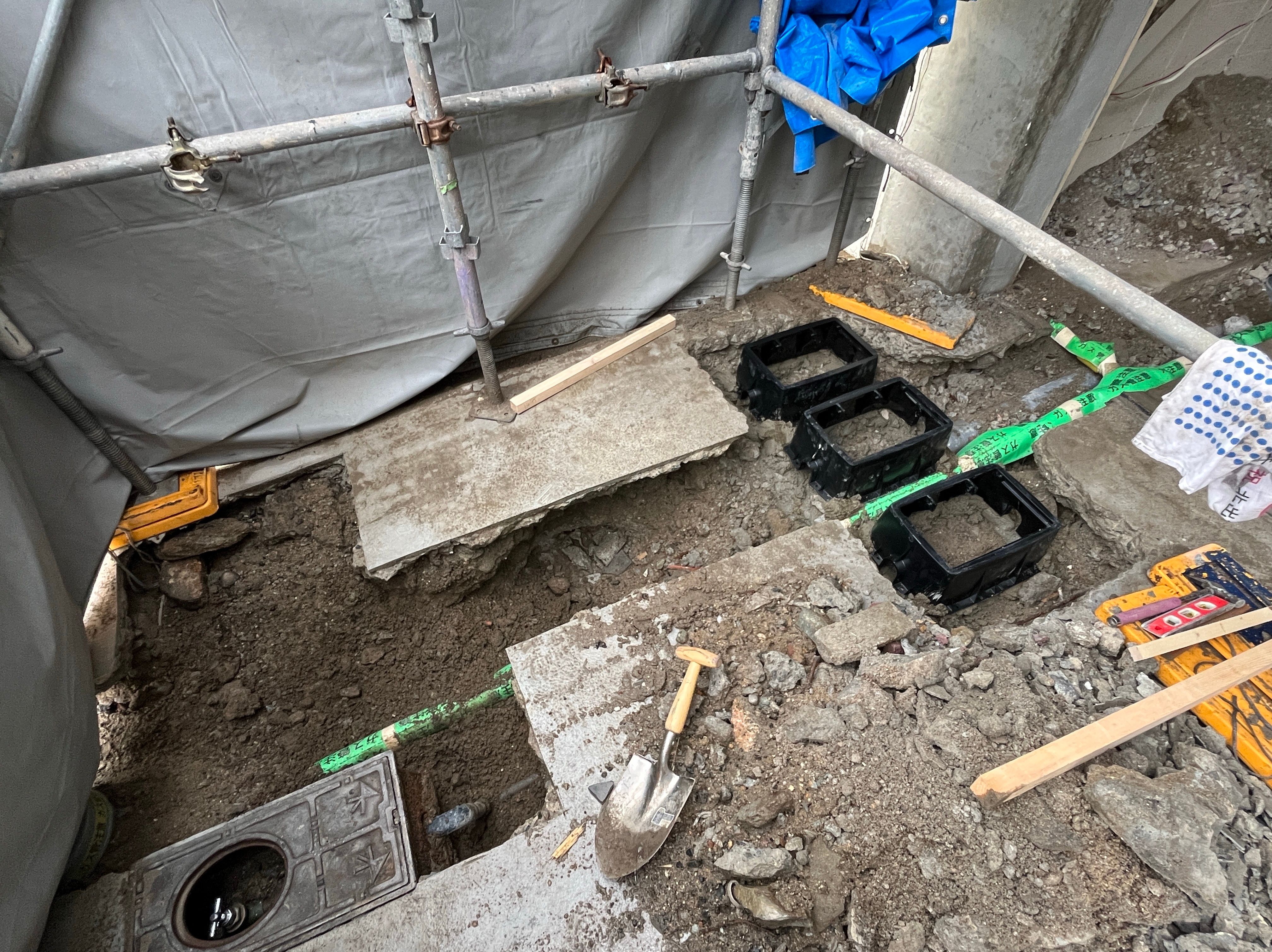 今回はテナント用に子メーター新設と給排水配管の全入れ替えで全て新しく曳き直しました。