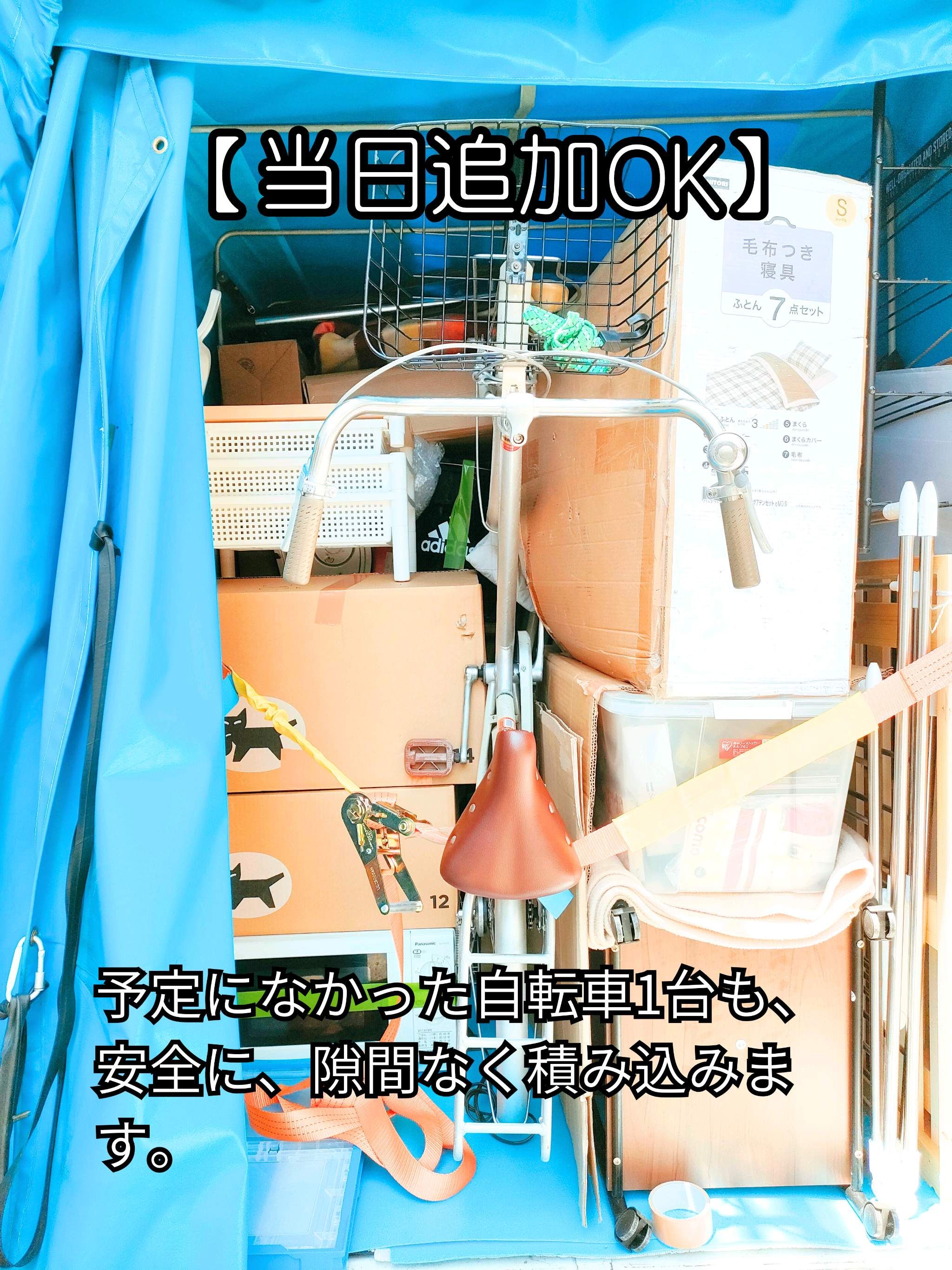 お写真の通り、段ボールや家具で埋まったトラックのわずかな隙間に自転車を配置。専用のベルトでしっかり固定し、荷崩れを防ぎながら1センチ単位のスペースを有効活用します。「積みきり(トラック1台分)」という契約であれば、その中に収まる限り、当日の追加分で追加料金をいただくことはほぼありません。