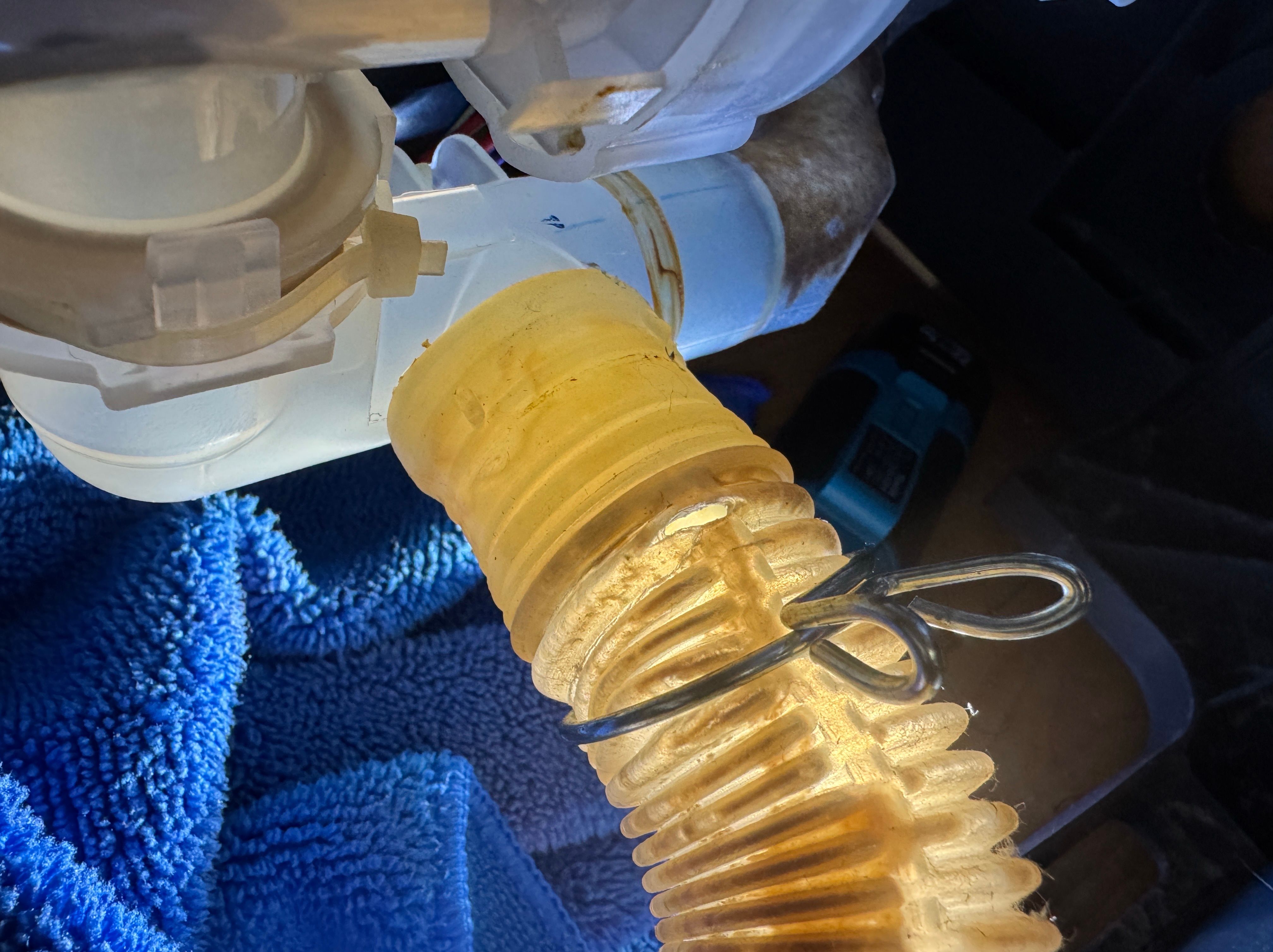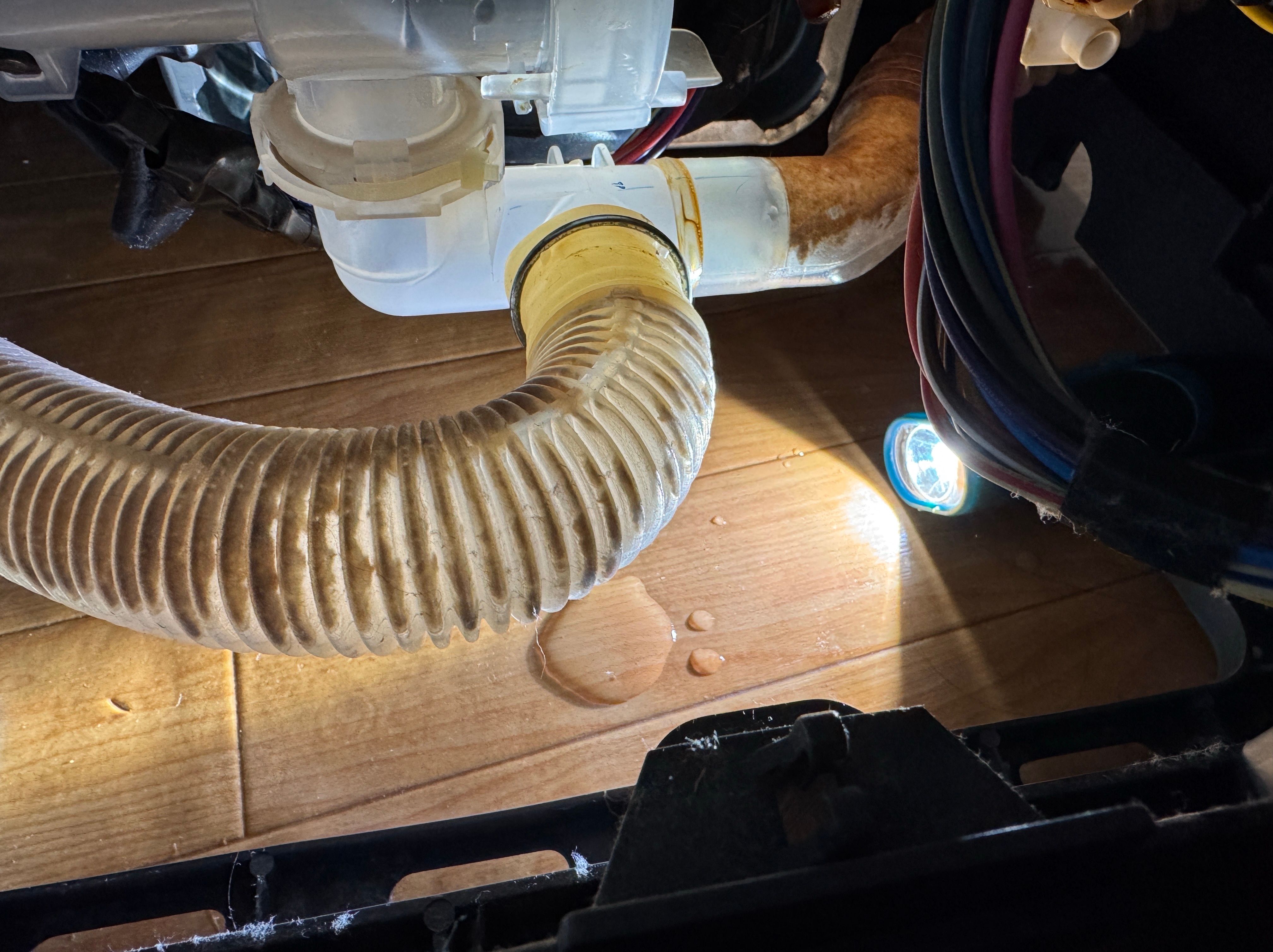 排水ホースに裂け目があり、そこからの水漏れが原因でした。新しい部品へ交換して対応しました。