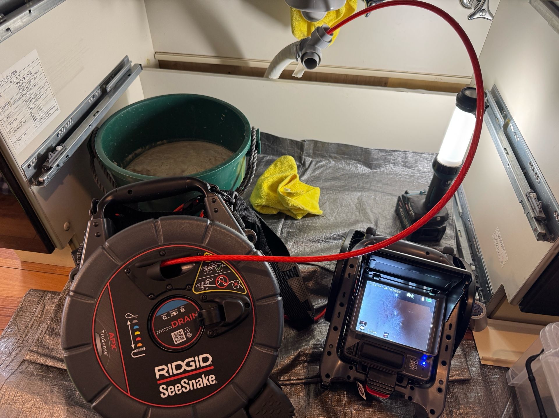 内視鏡を使って配管内部を見ると、脂で閉塞寸前の状況でした。