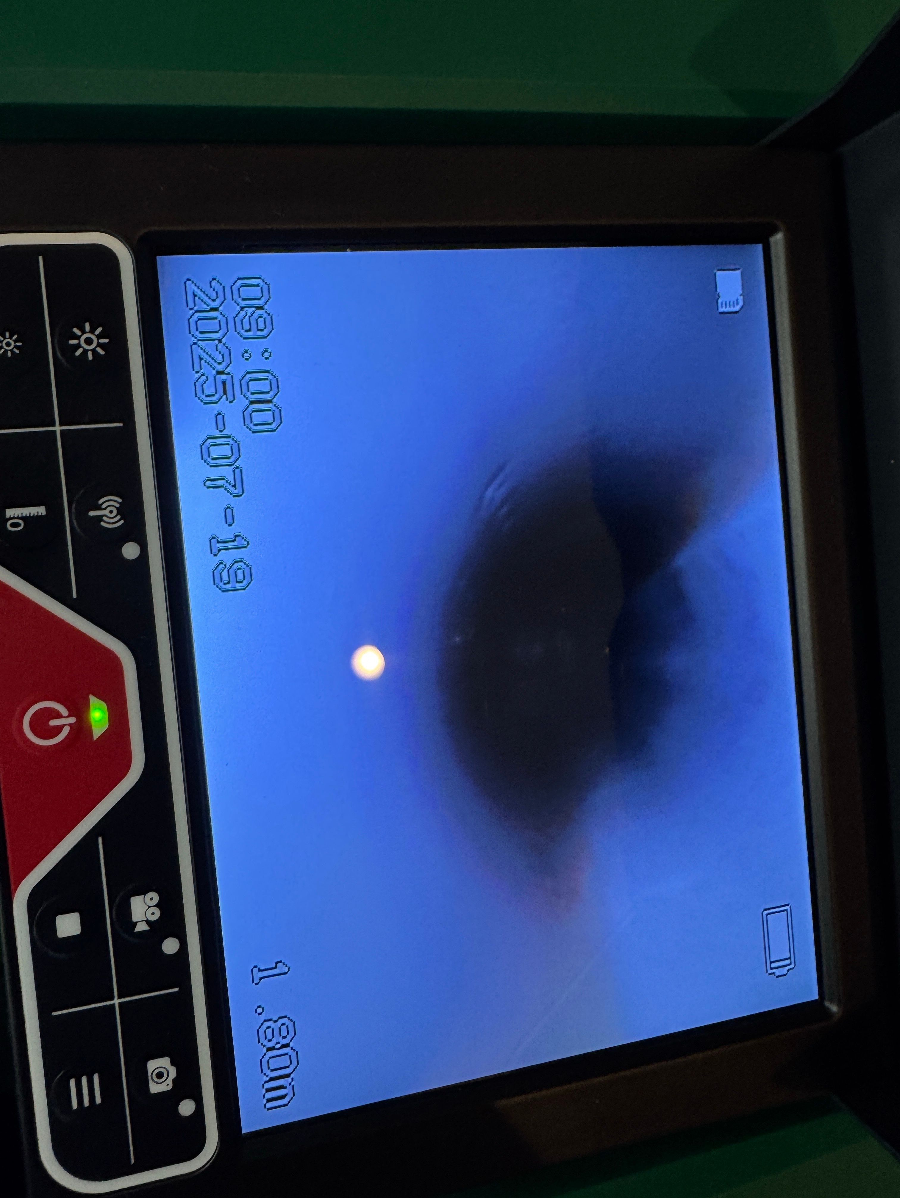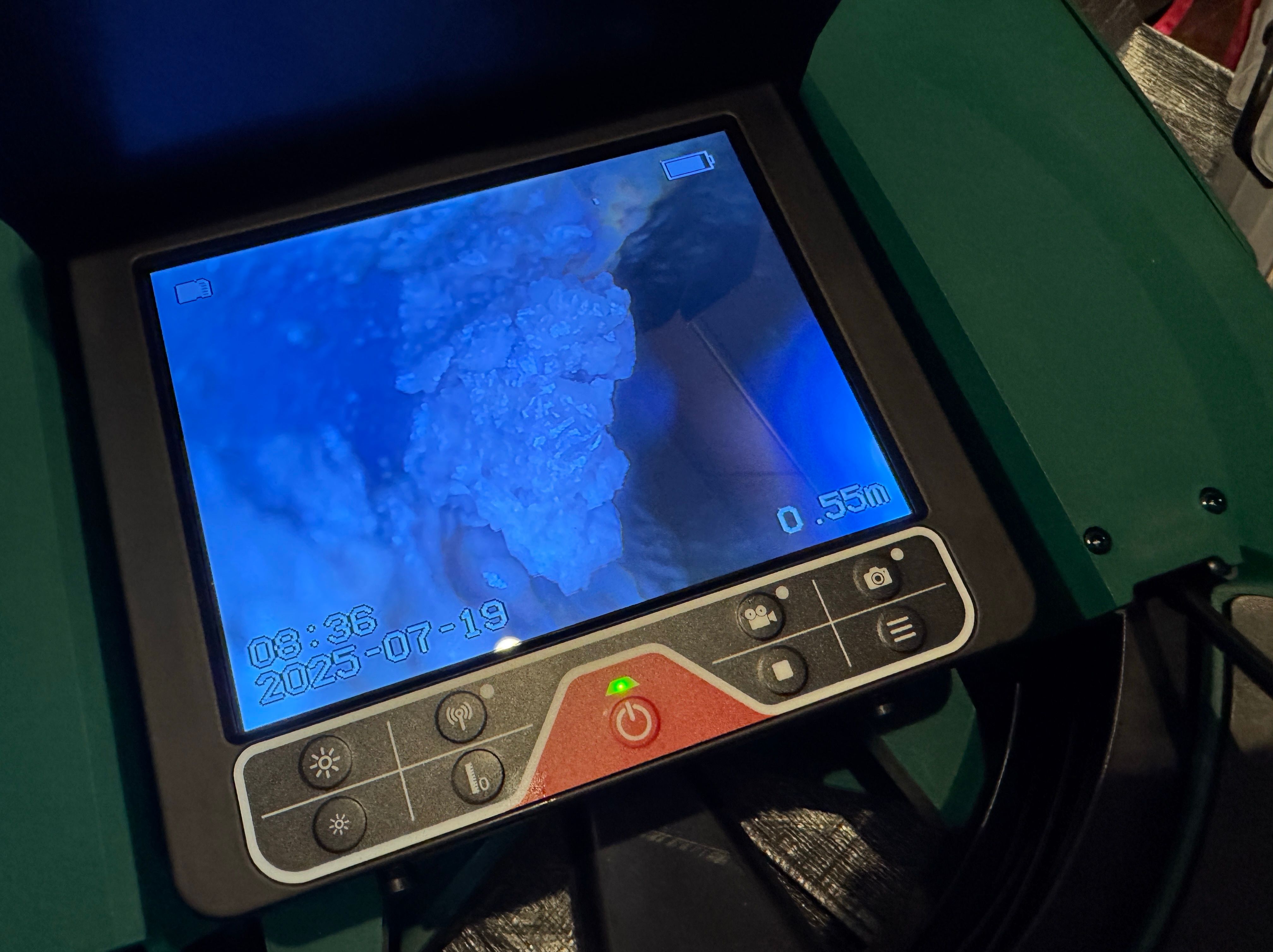 作業前に室内側の排水管を検査カメラで確認、お客様に見てもらってから洗浄開始します。