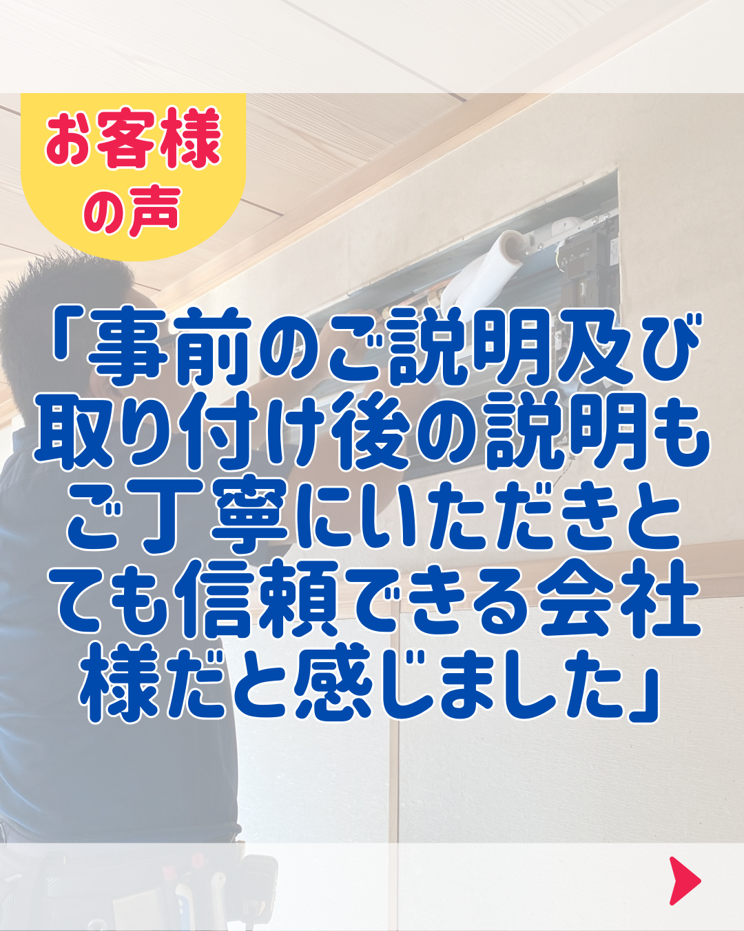 取り付けはもちろんのこと、事前のご説明及び取り付け後の説明もご丁寧にいただき、とても信頼できる会社様だと感じました。