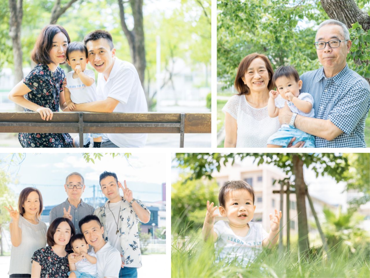 集合写真、息子のワンショット、ベンチに座った写真など、
