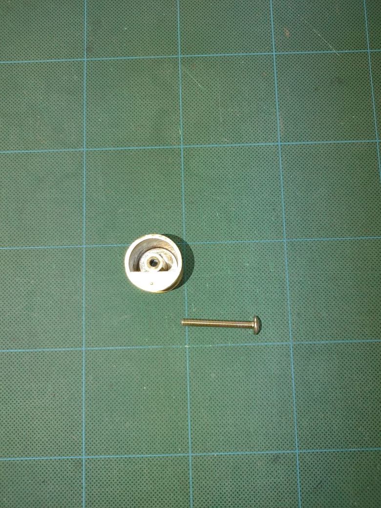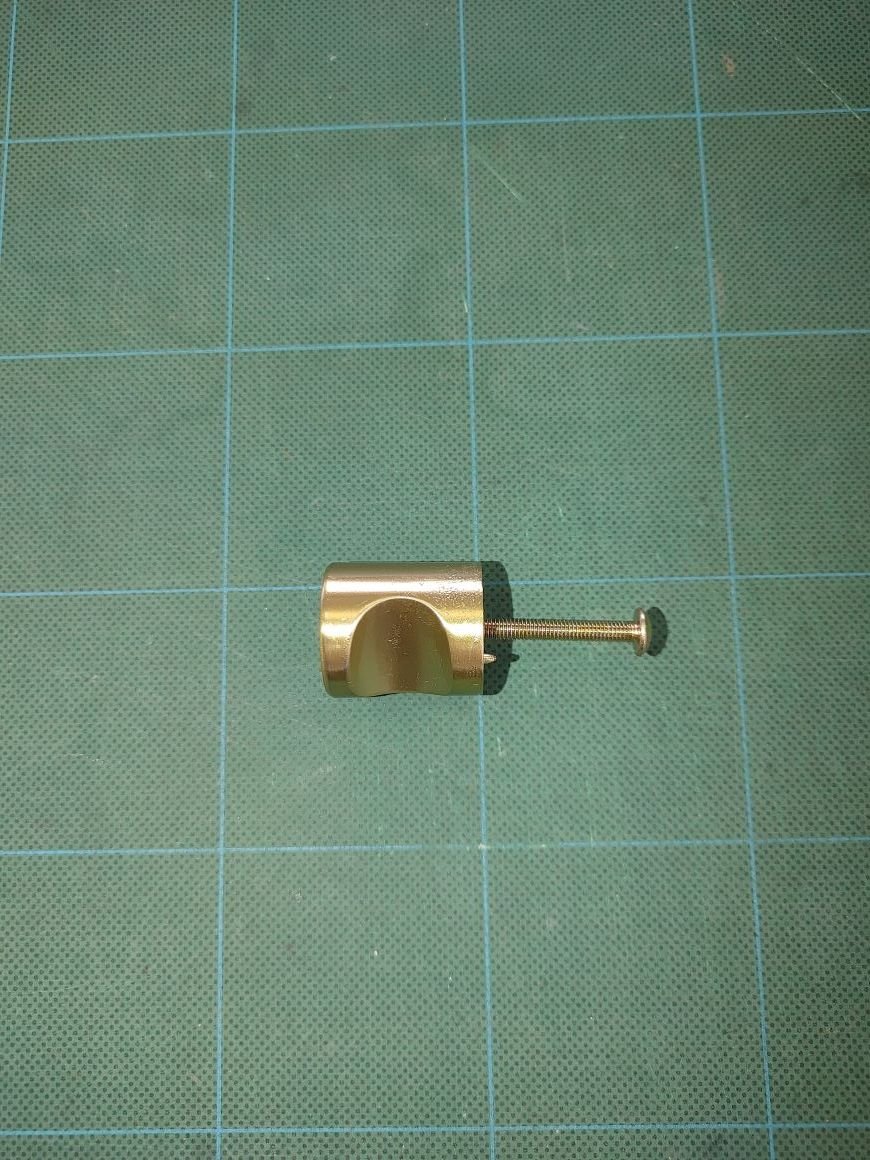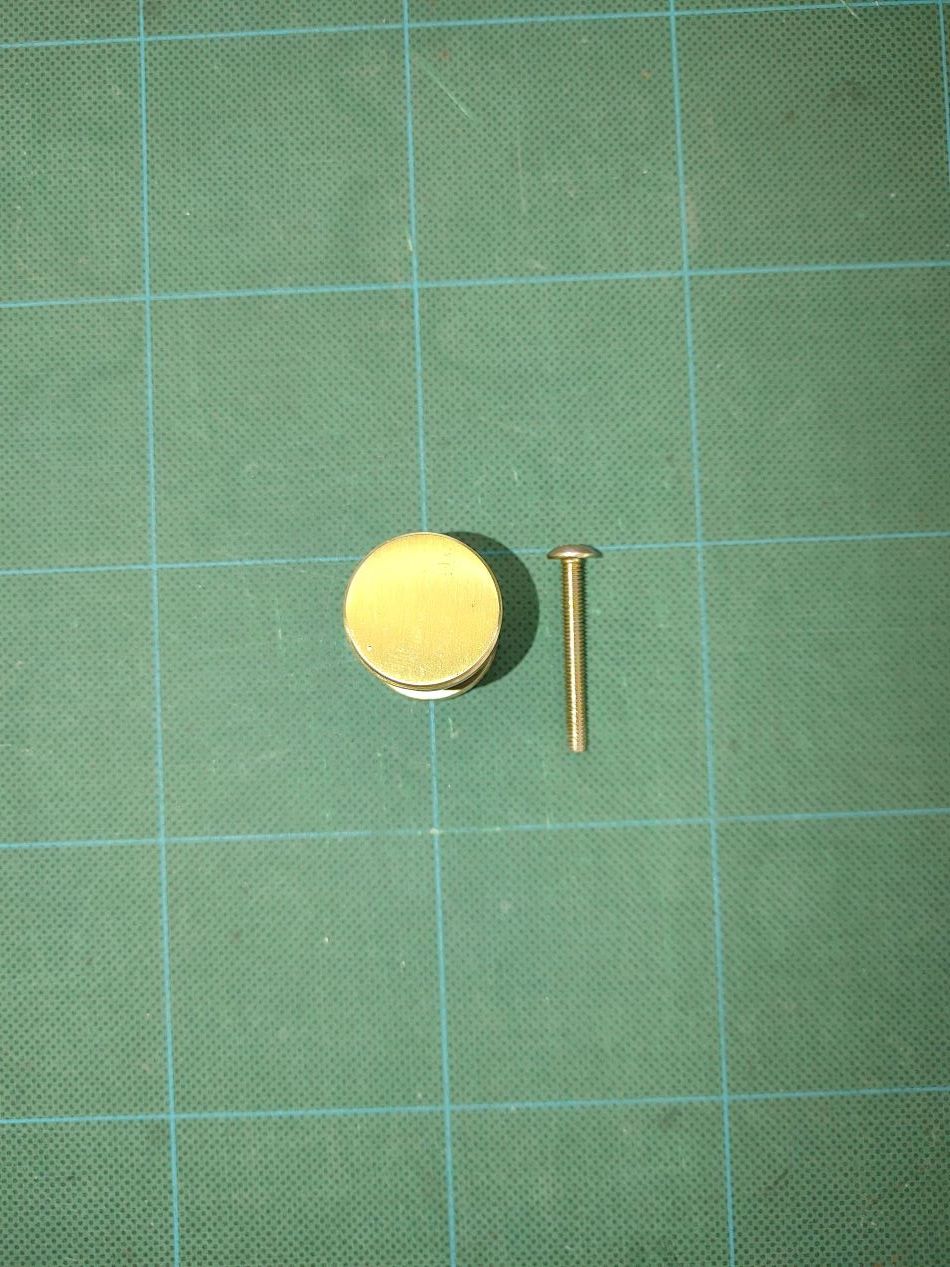 引き出し』や『物入れ扉』に良く使われる 円筒ツマミ…1個の注文です。 直径が25㎜で、色はゴールド 取付けが簡単に思われますが ビス穴を真っ直ぐに開けないと うまく締まりません。 真上から見るのでなく 少し横から覗きこむように、穴開けすると うまくいきます。 管理 D-8
