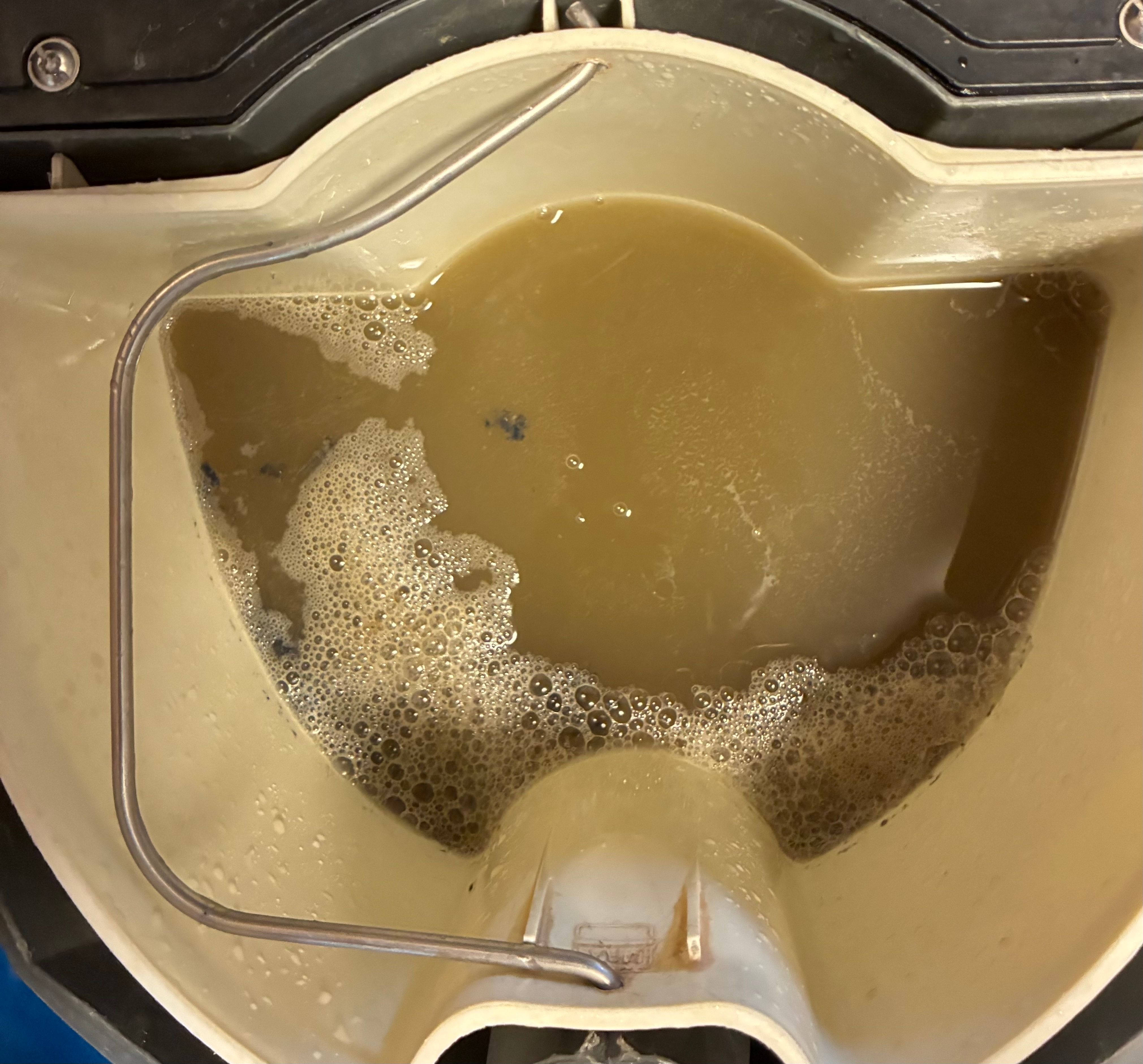 「これが、洗浄後に出てきた汚水です。お客様も『この上で寝ていたなんて…』と驚かれていました。この濁りの正体は、蓄積された汚れ、汗成分や埃です」