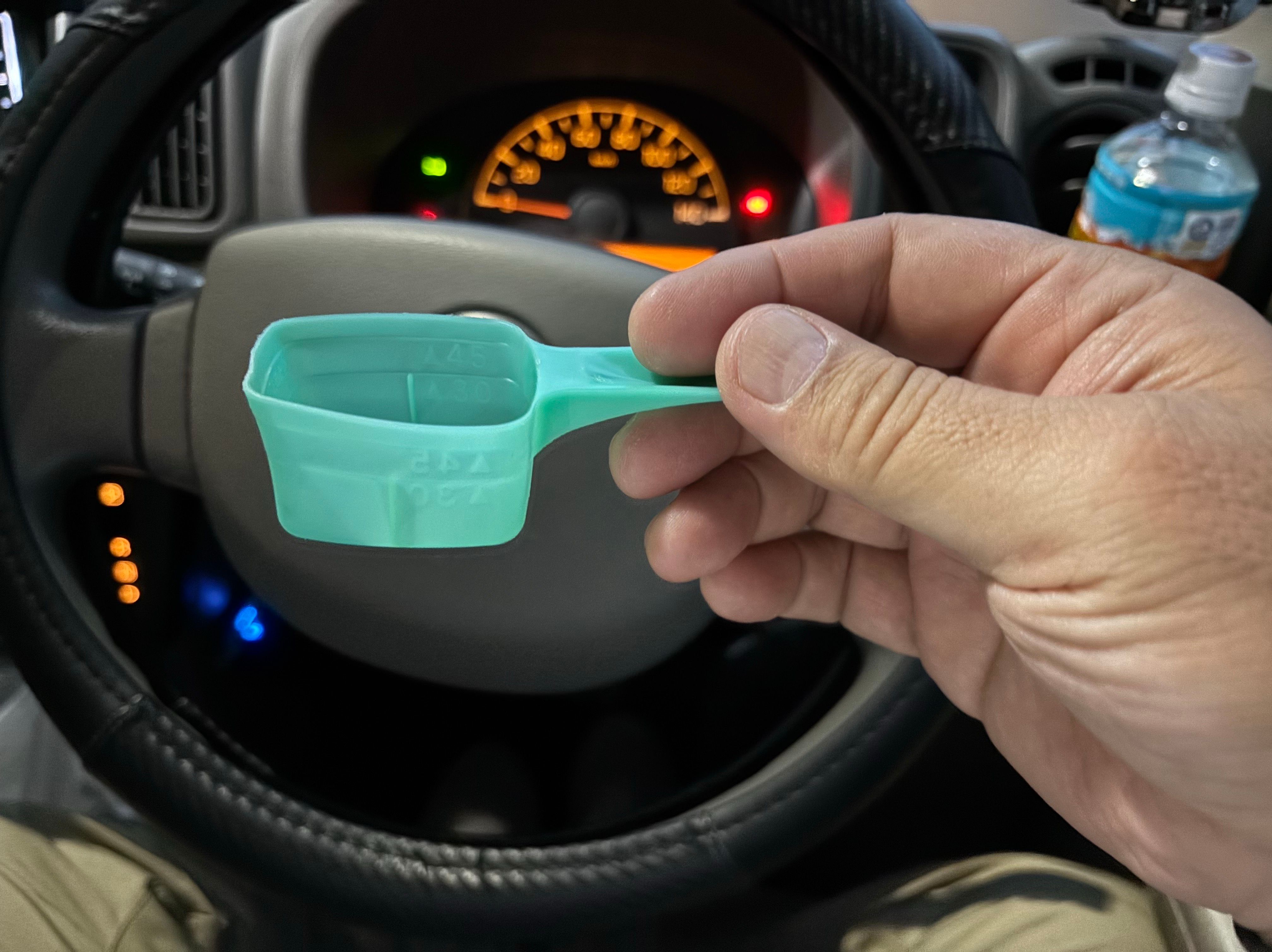 すると、管の奥に光る異物を発見――それは 洗濯洗剤の計量カップ でした。