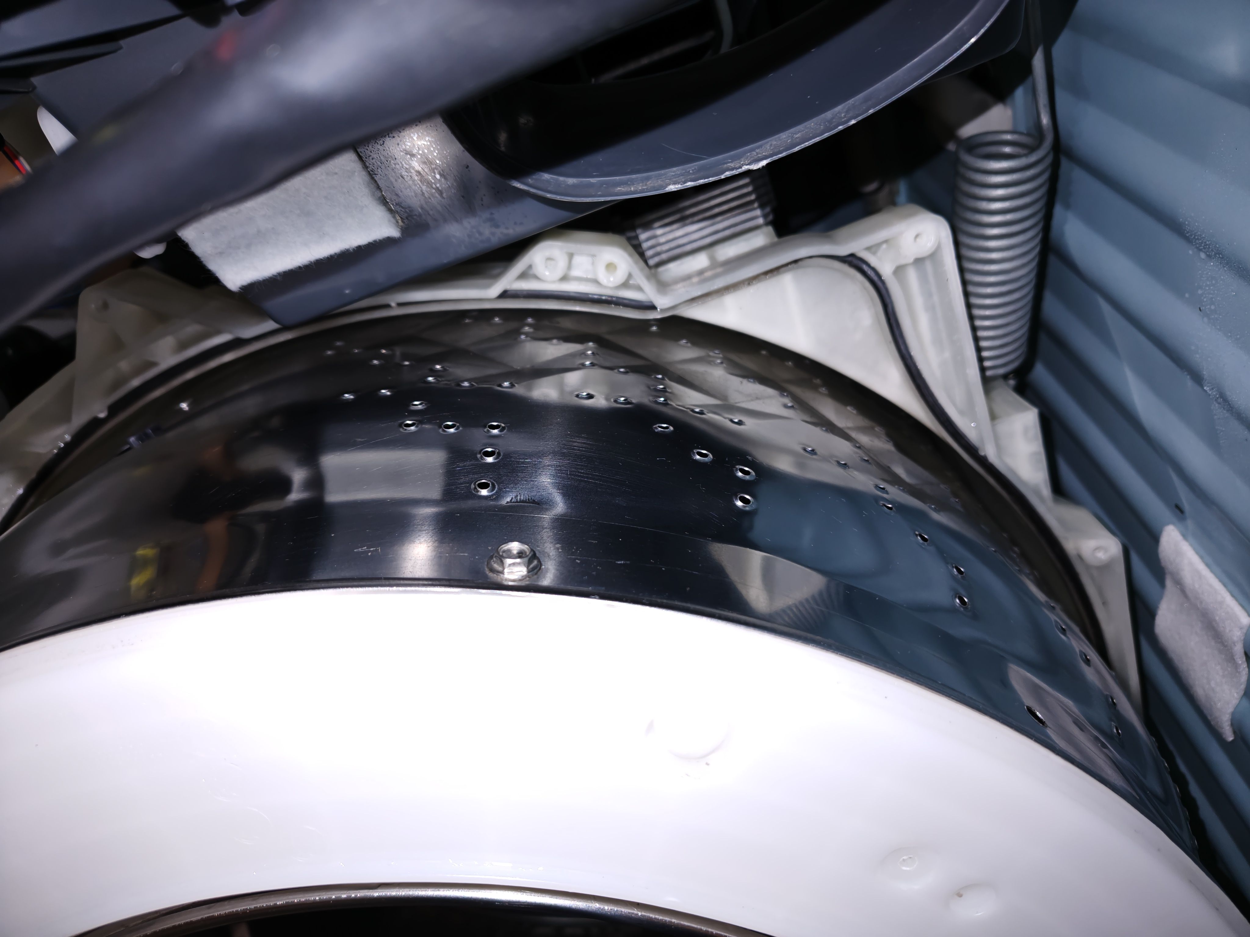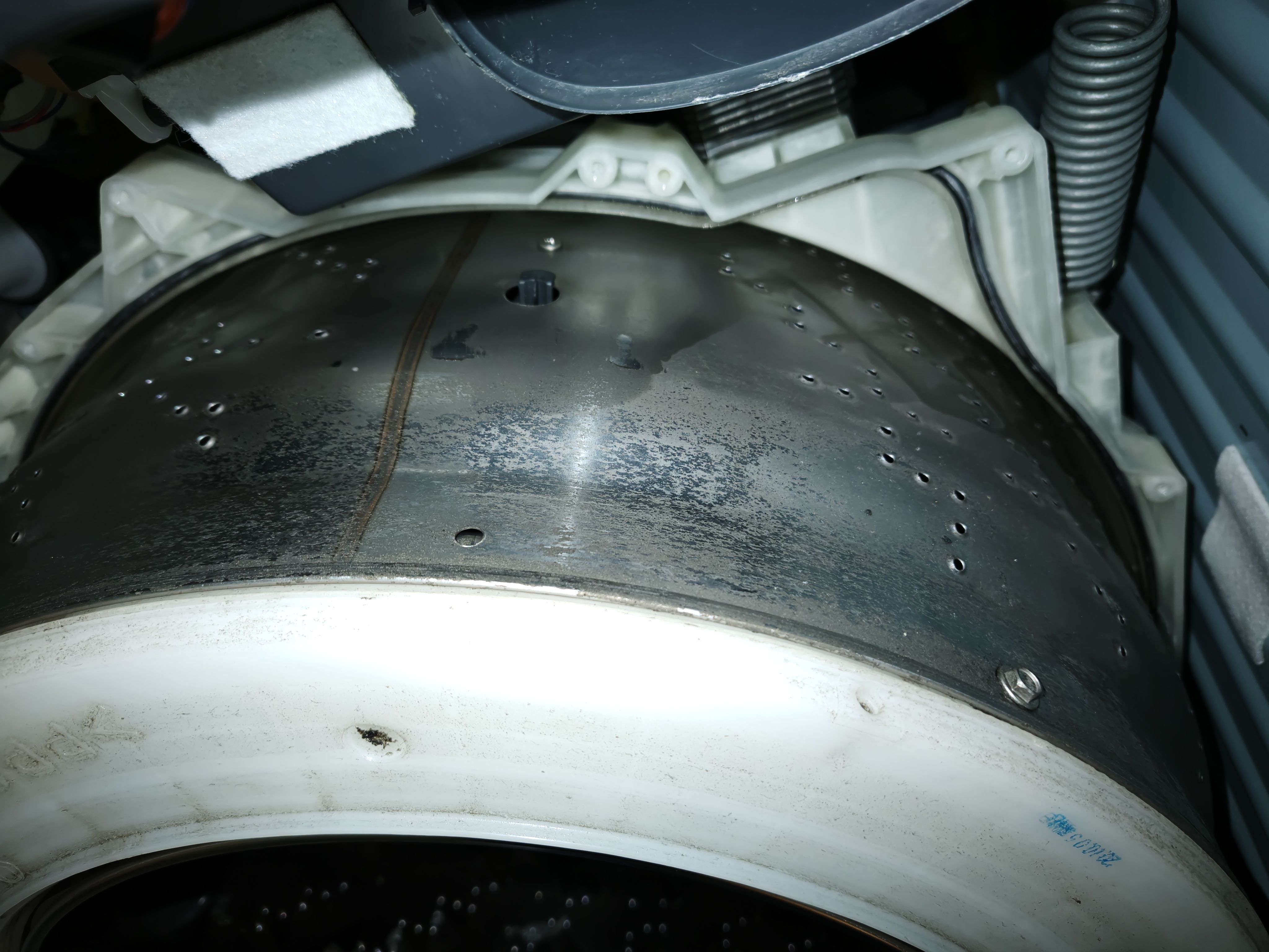 3/6 ドラム式洗濯機の内部にブラシを落としたということで、分解ついでにお掃除を承りました。毎回乾燥を使っていらっしゃるとのことで洗濯槽はカビだらけ、というわけではありませんでした。やや洗剤残りが目立ってはいます。