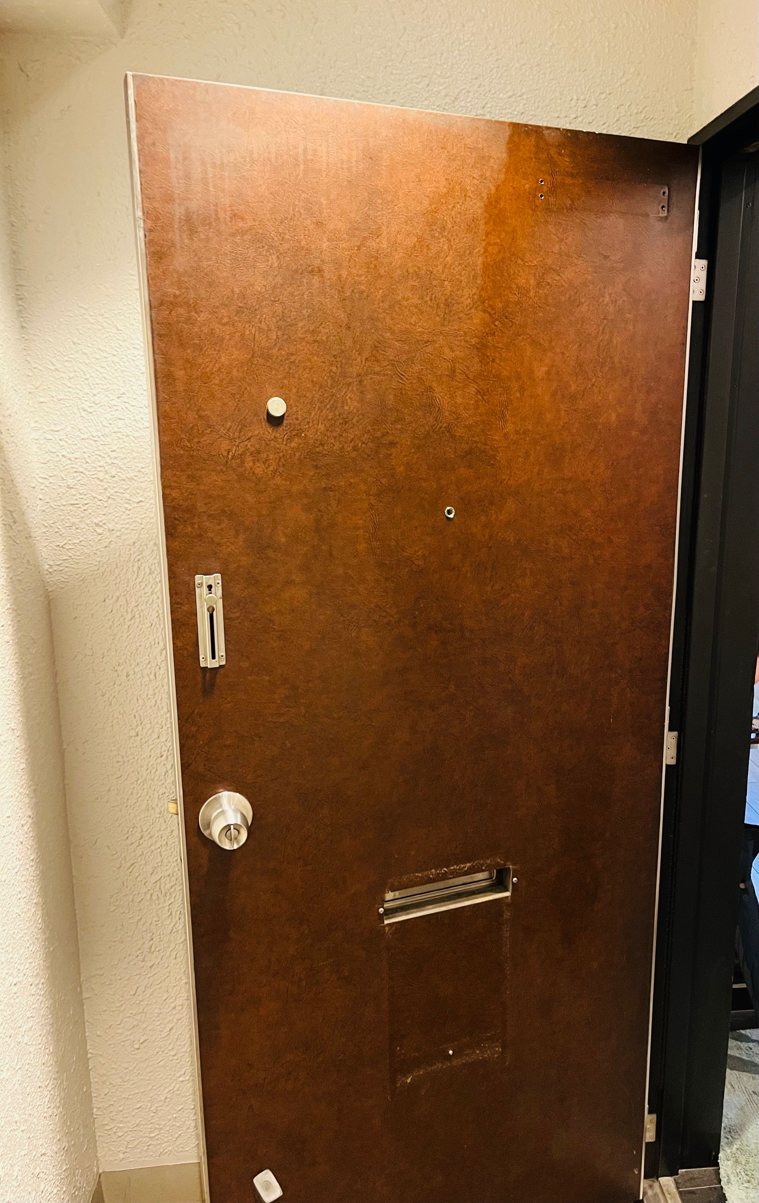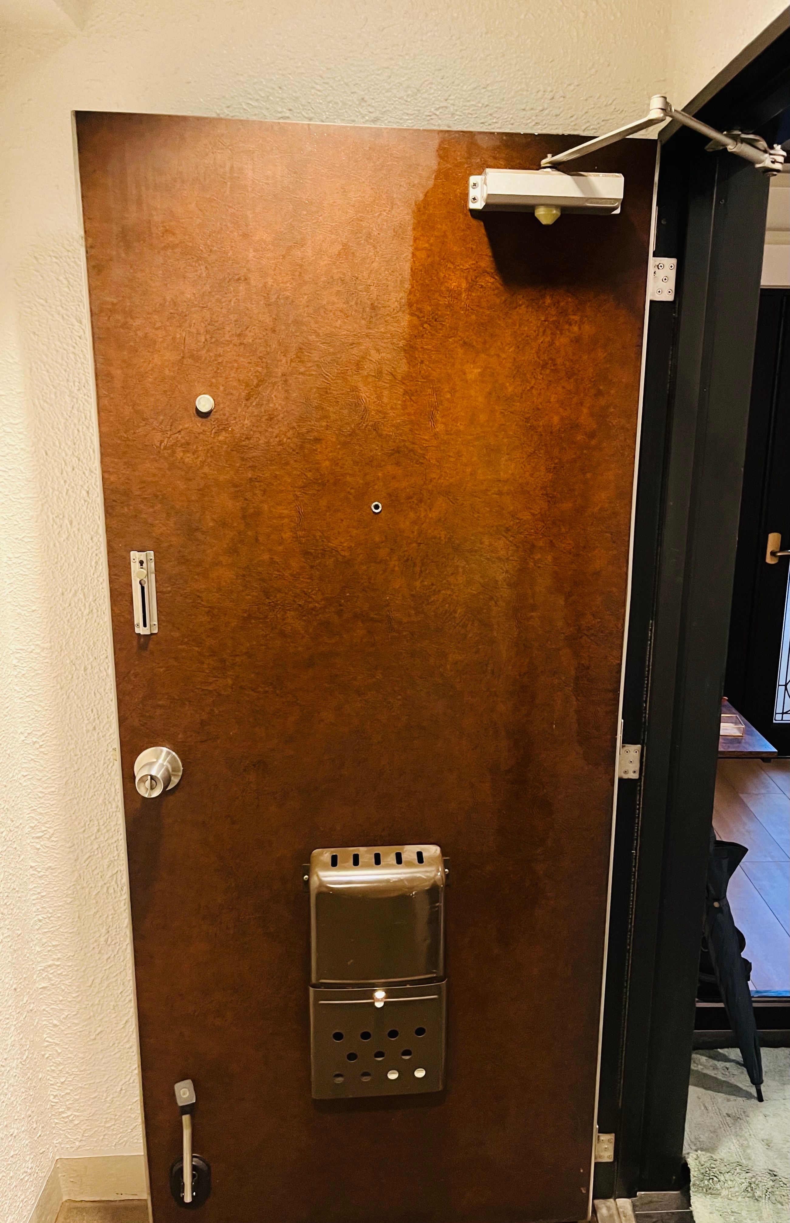 目黒区で家電搬入のために玄関扉のドアクローザーとポストの脱着を行いました