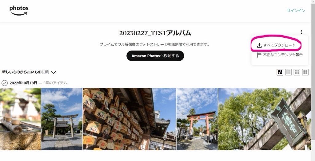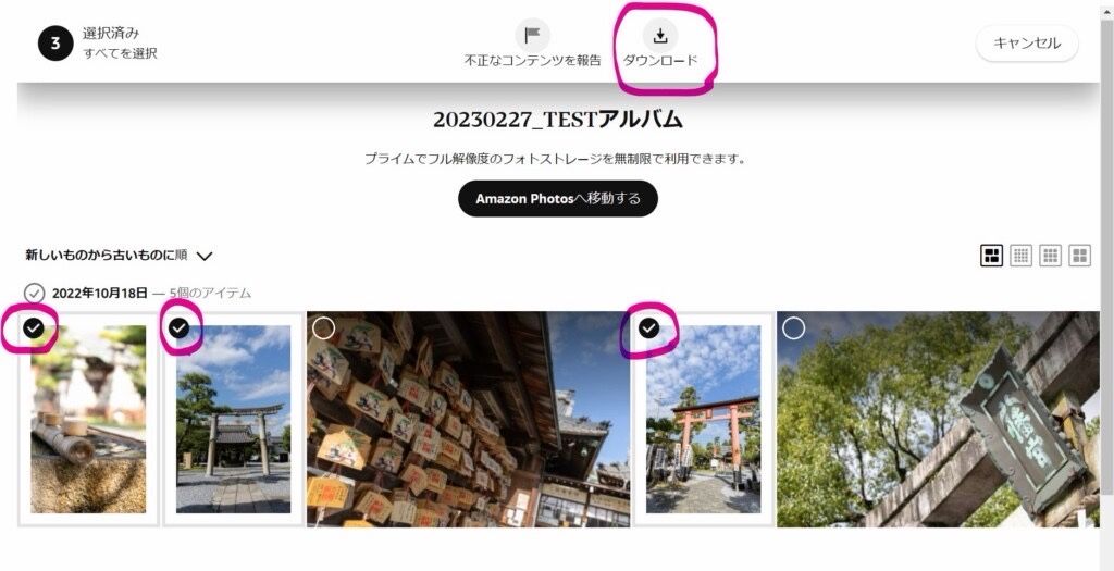 ダウンロードしたい写真を選び、チェックマークを付けると、上に「ダウンロード」のボタンが表示されます。