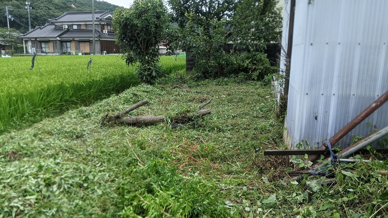 空き家の周りの草刈り作業と伐採作業
