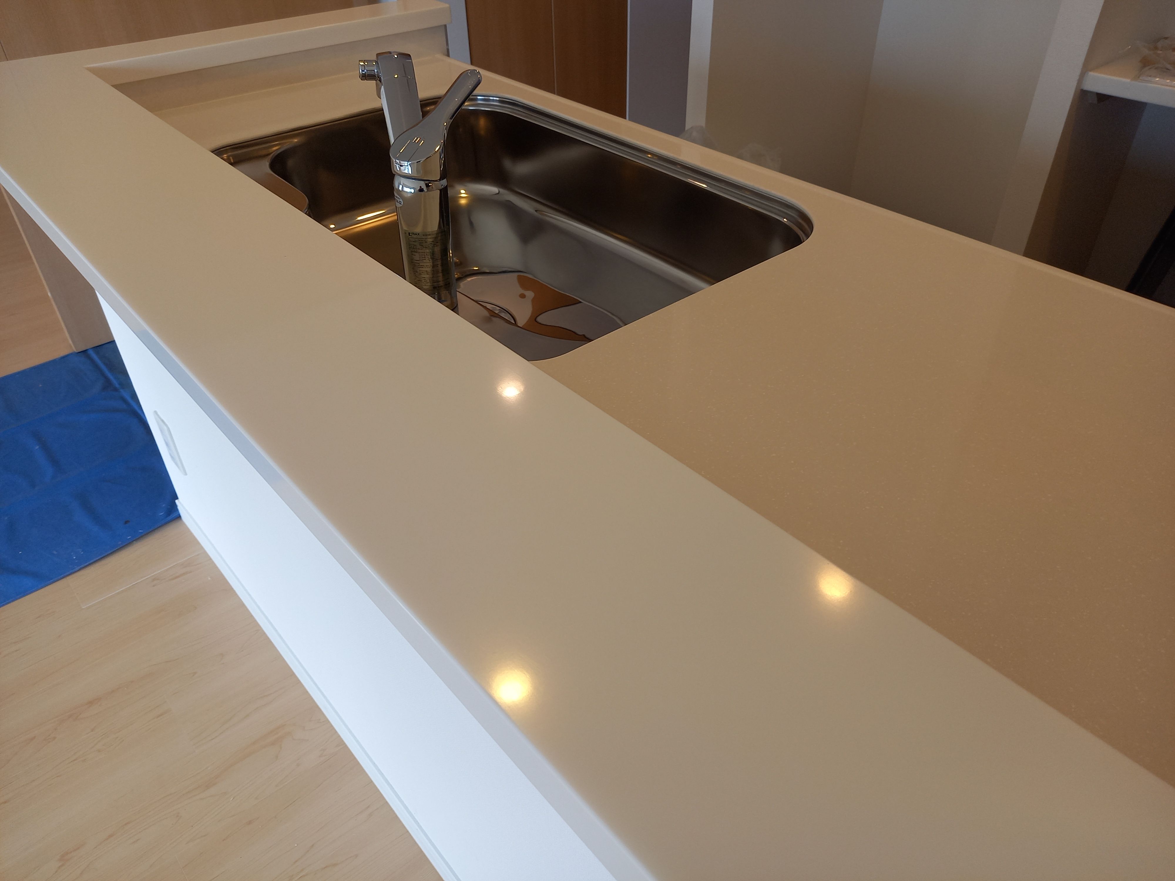 分譲マンションを購入された方からの依頼でキッチン人工大理石天板とステンレスシンク研摩コーティング施工しました。