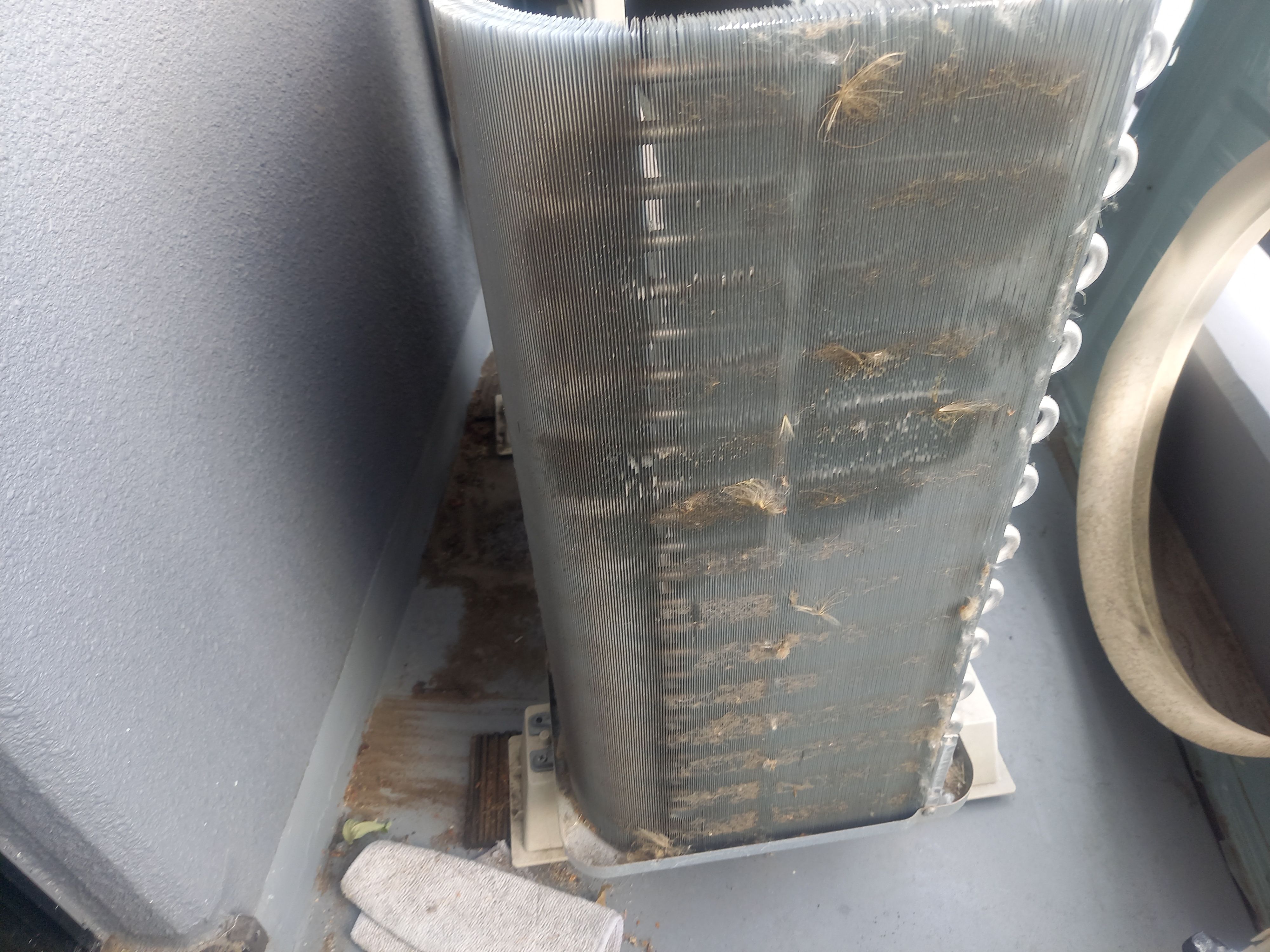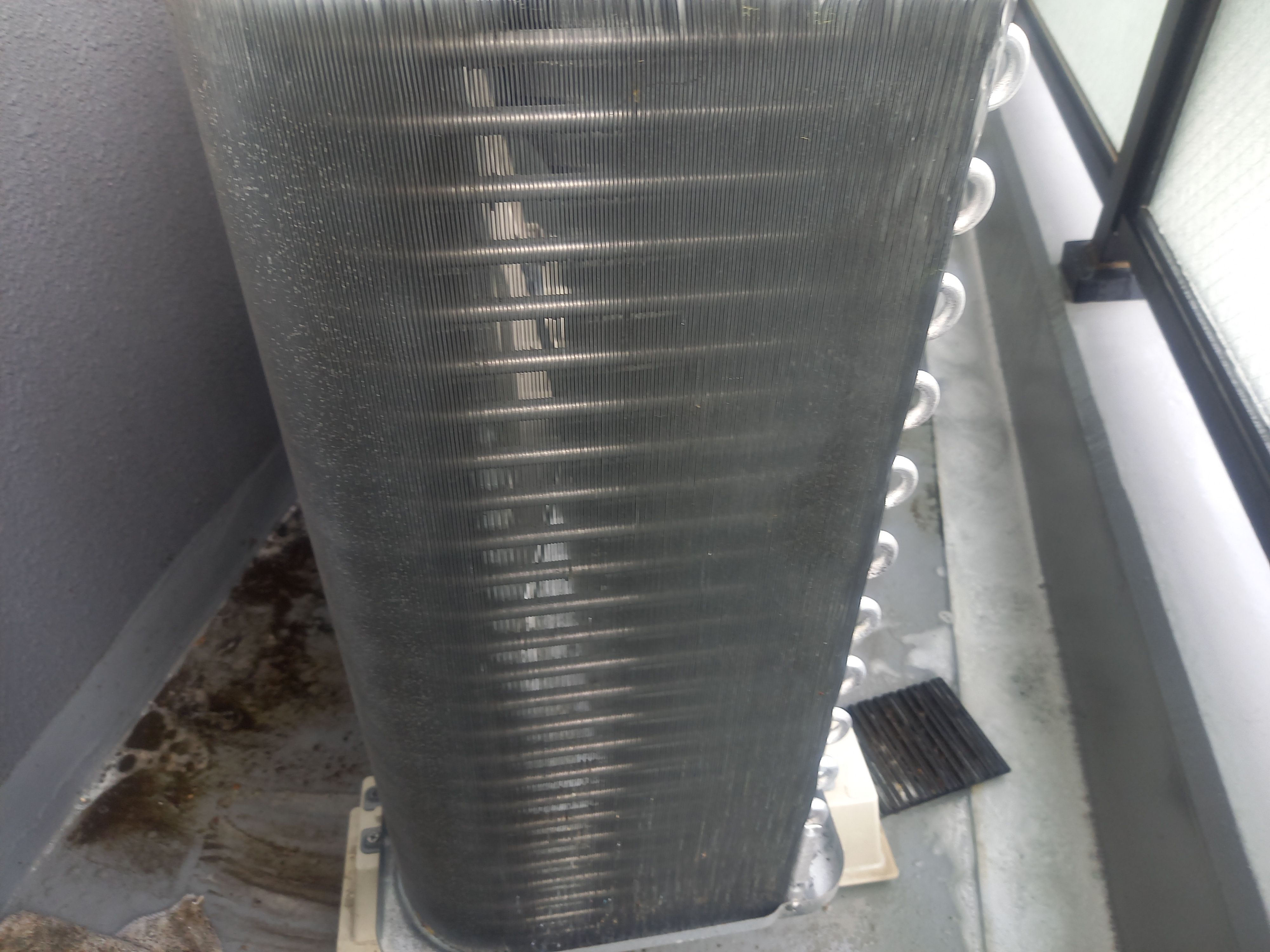 築5年程の分譲マンションの室外機クリーニング。まだ新しいのですが周囲に木々が多く落ち葉が入り込んでいる様子です。以外と汚れてました。エアコン専用の洗浄剤を吹きかけるとキレイになりました。これで効率良くエアコンをお使い頂ける事と存じます。