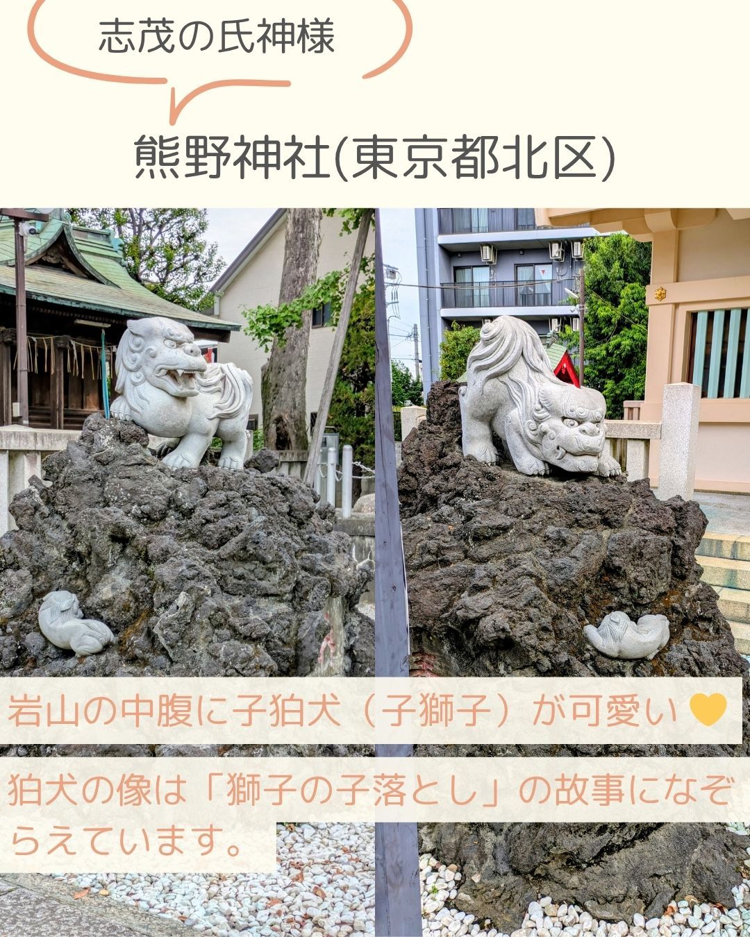 狛犬の像は「獅子の子落とし」の故事になぞらえています。岩山の中腹に子狛犬(子獅子)がいて、可愛い💕勇ましい出で立ちの親狛犬が角度を変えてみると優しい親に見えます。