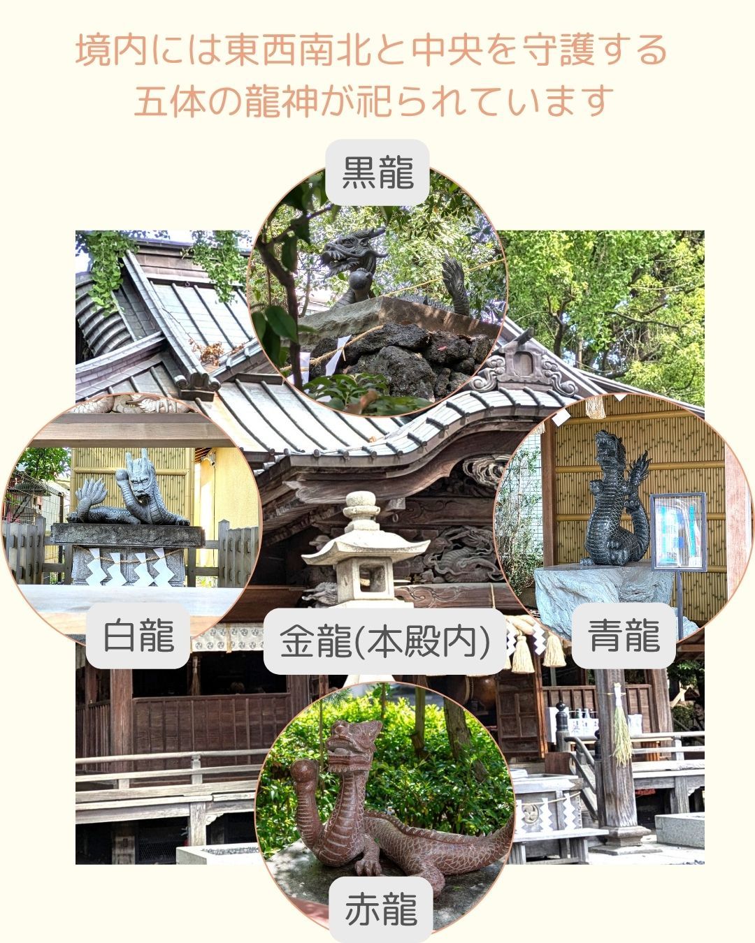 境内には東西南北と中央を守護する五体の龍神が祀られており、金龍・青龍・赤龍・白龍・黒龍として水脈・方位・天候を司る存在とされています。参拝者はそれぞれの龍に願いを込めて巡拝することができ、商売繁盛・五穀豊穣・厄除け・開運などのご利益で知られています。